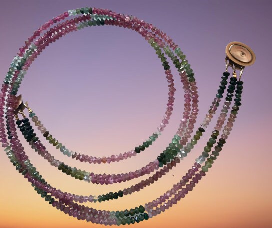 Fine Triple strand necklace of varied tourmaline beads.