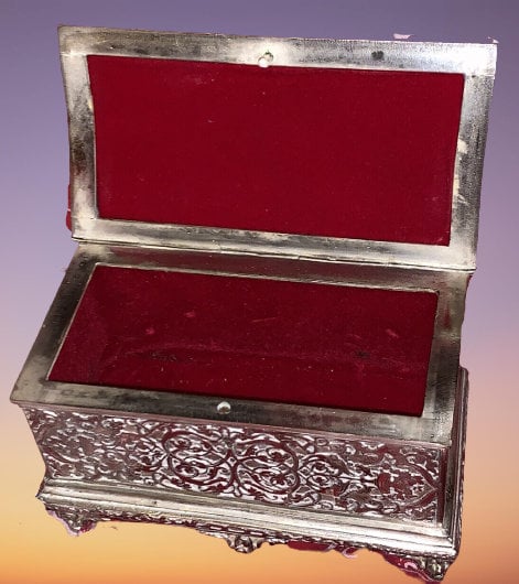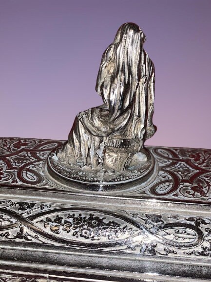 French casket box from 18oo,s. Features figure of woman on top with heavy raised relief metal work throughout. Interior maroon velour lined.four footed base.