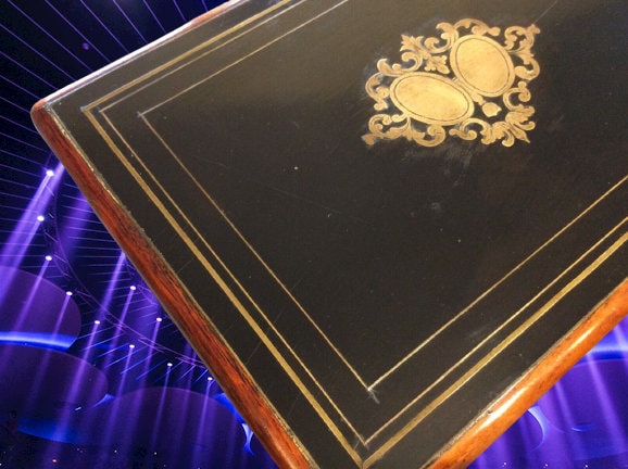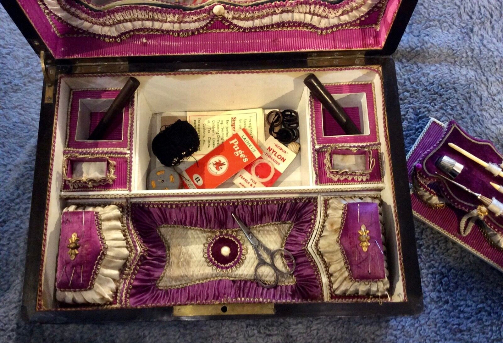 Exquisite Necessaire. Fitted with velour with ruffle and cord. Mirrored cover lid.. Various sewing implements..please review. Inset compartments. Rare find. In good condition. Nips and flaws minimal for it,s age. Please review pics carefully as they can describe so much. Have scent potties available should you choose for set in seperate listing. Just ask!