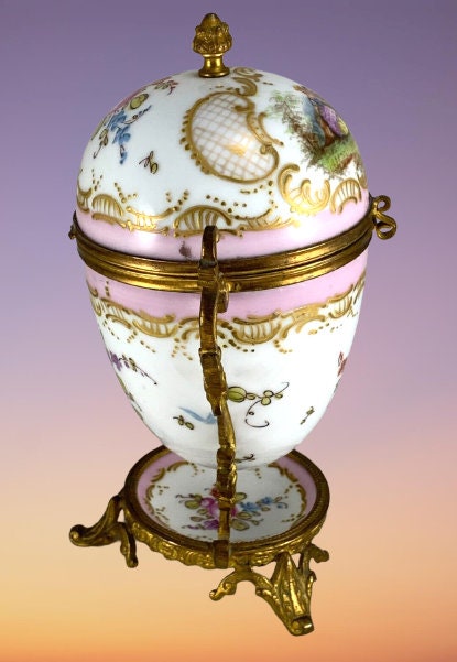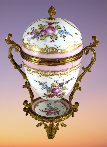 French kiln fired Enamel casket box. Large egg set in scrolling stand with base. Hinged with s shape. floral motif