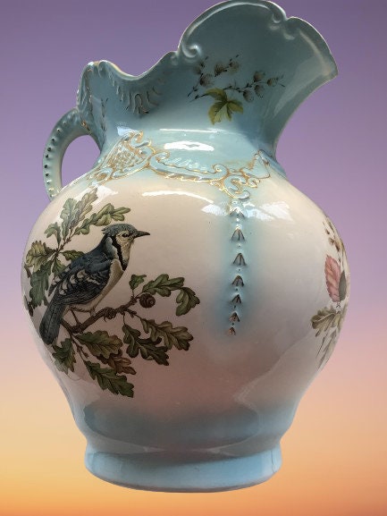 Exceptional pitcher and water basin. Baby blue with gilt highlights. Features blue jay.. base stamped with gilt birds.