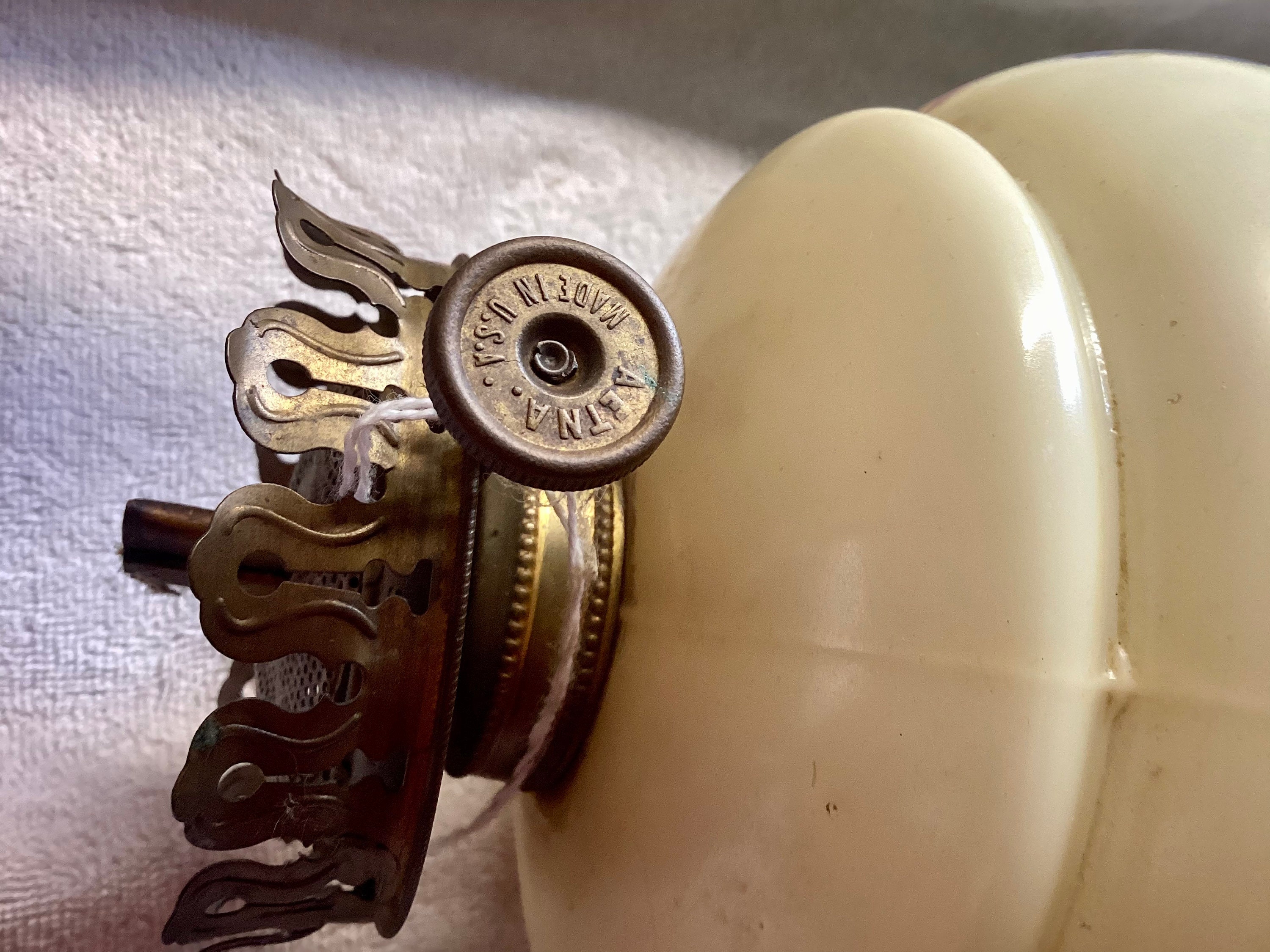 Etna oil lamp base. Yellow with accent detailing in florals. Pierced metal base. Made in U.S.A.