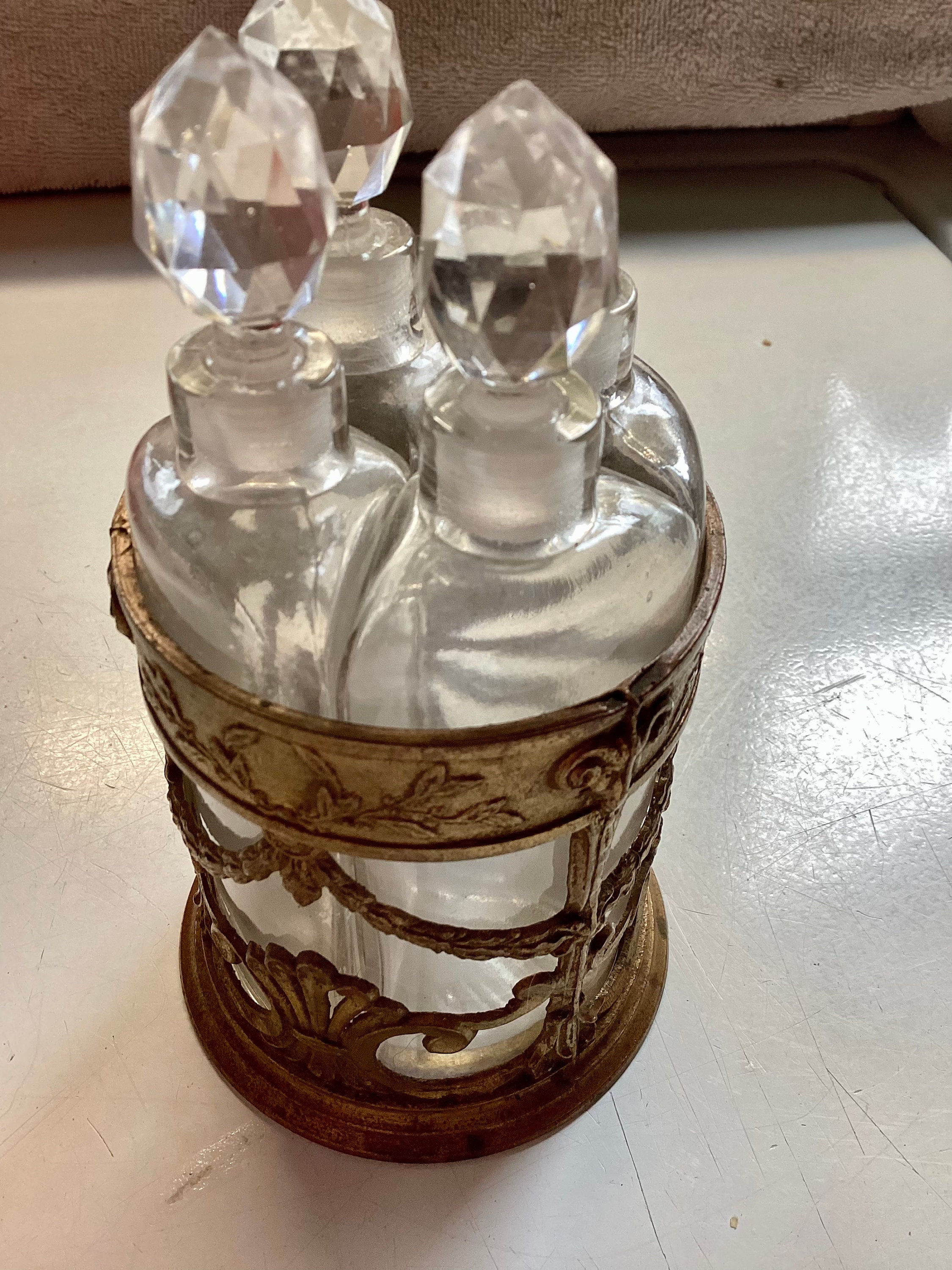 French crystal scent perfume stand. Features four bottles set in gilt metal carriage. One stopper missing. Four bottles included