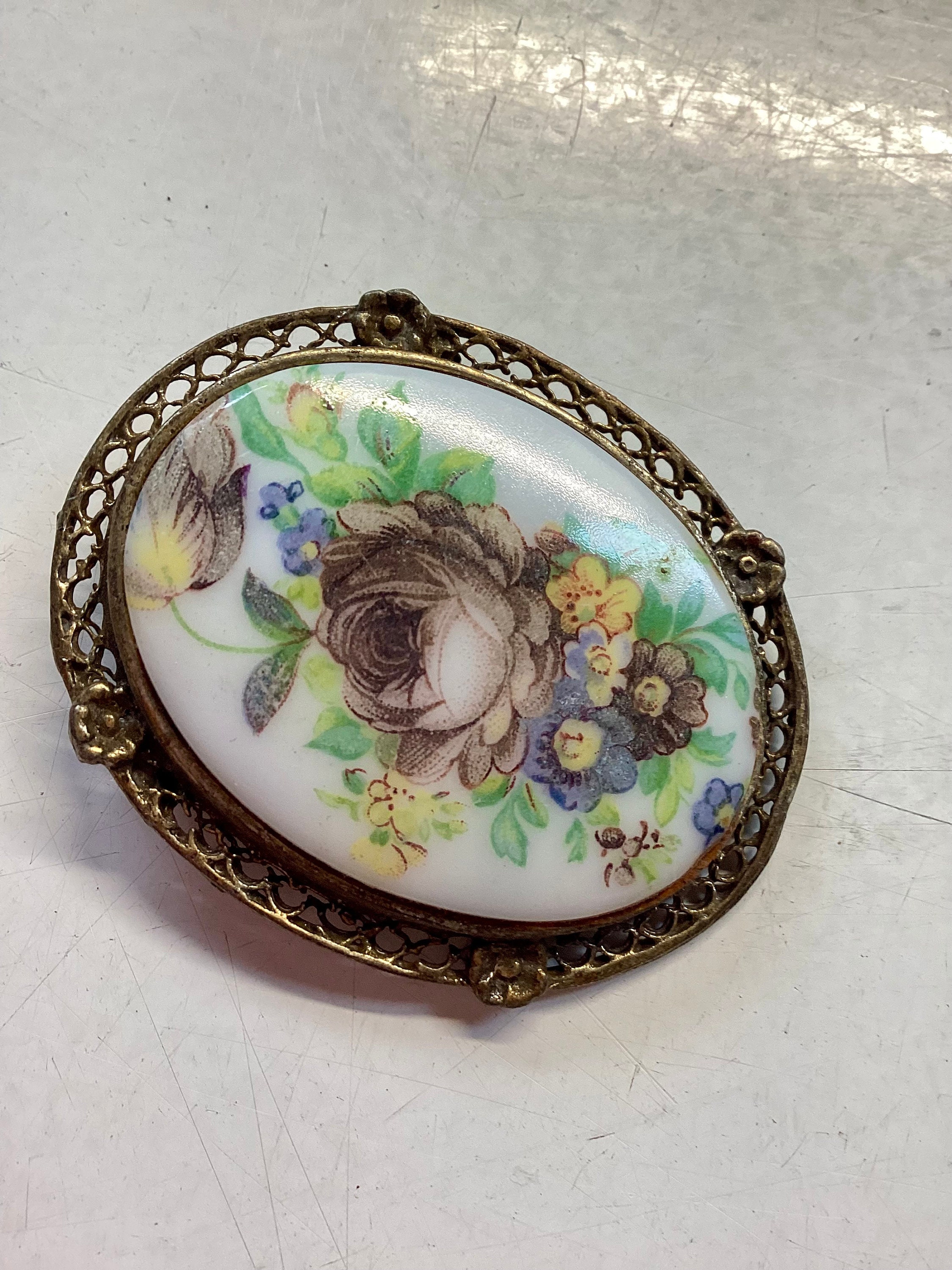 Antique brooch pin. Done in florals. Pin back