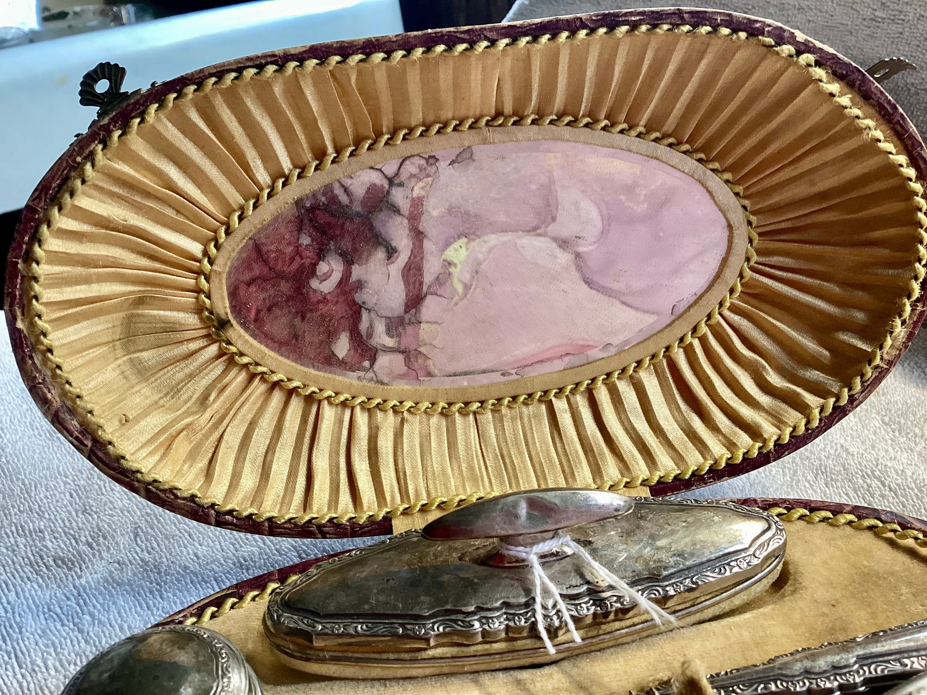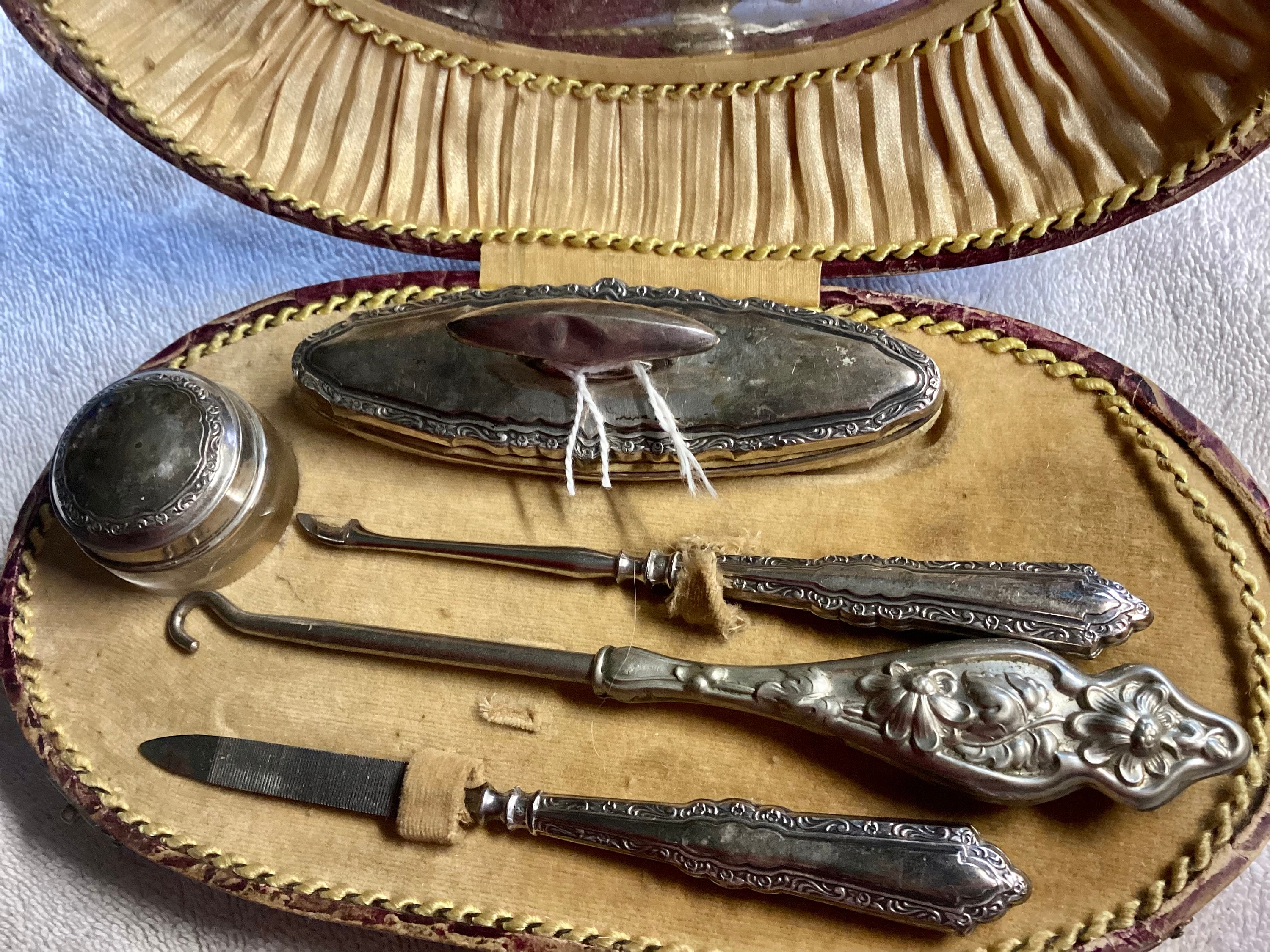 Silver Victorian vanity set. Includes a glass pot with silver cover lid, buffer, book hook, and two files. Tufterdbcoverlud with fixed mirror. Cording needs realized as well as a loose closure tab. Box lined in tank. Velour. Hinged back with two front clasps.