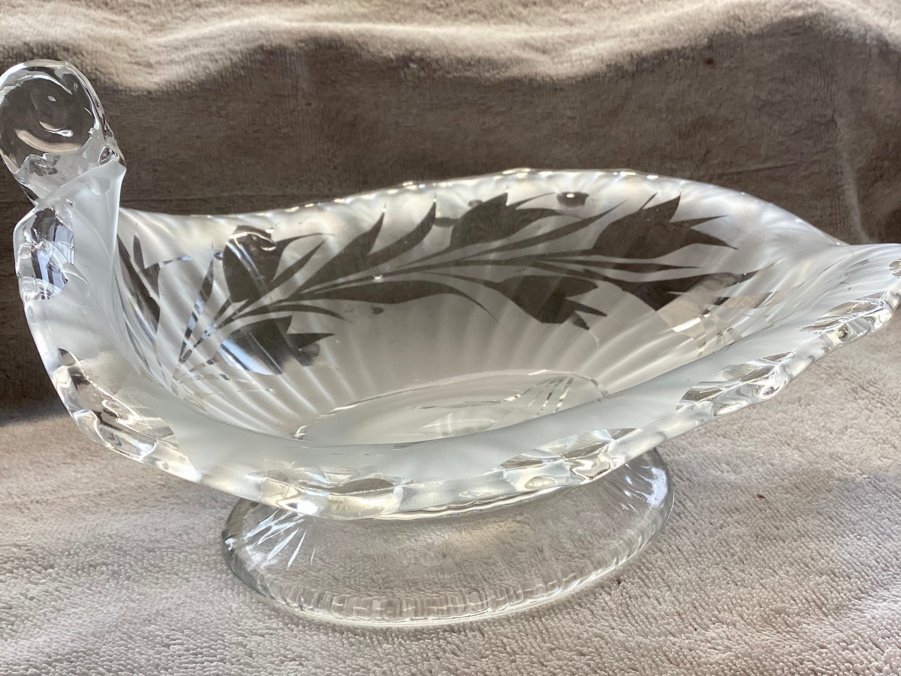 Outstanding frosted crystal centerpiece. Sweeping upturn on left with right tip side to resemble a leaf. Frosted with floral cutouts. Sets on peristalsis base. Not to be mis