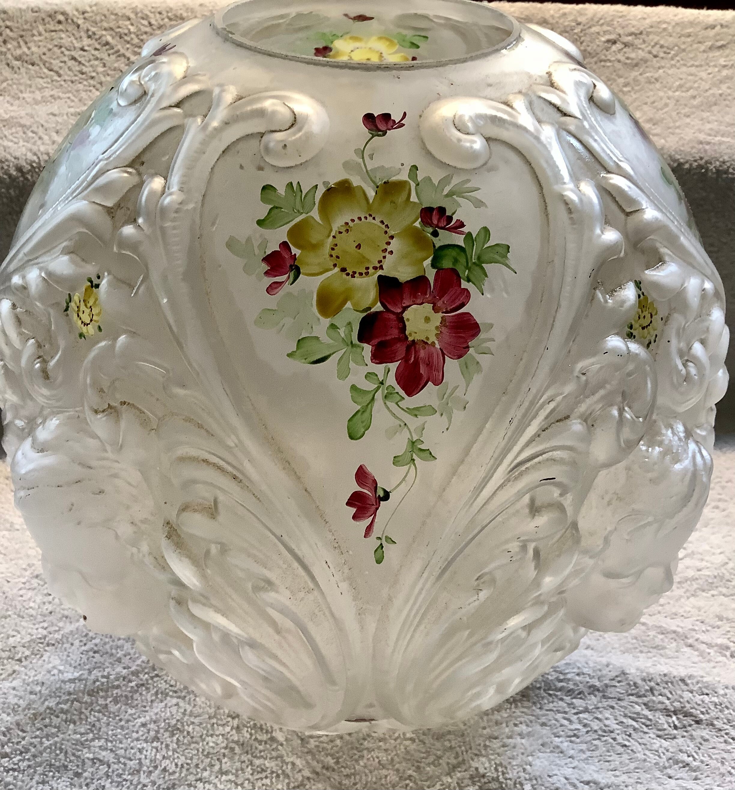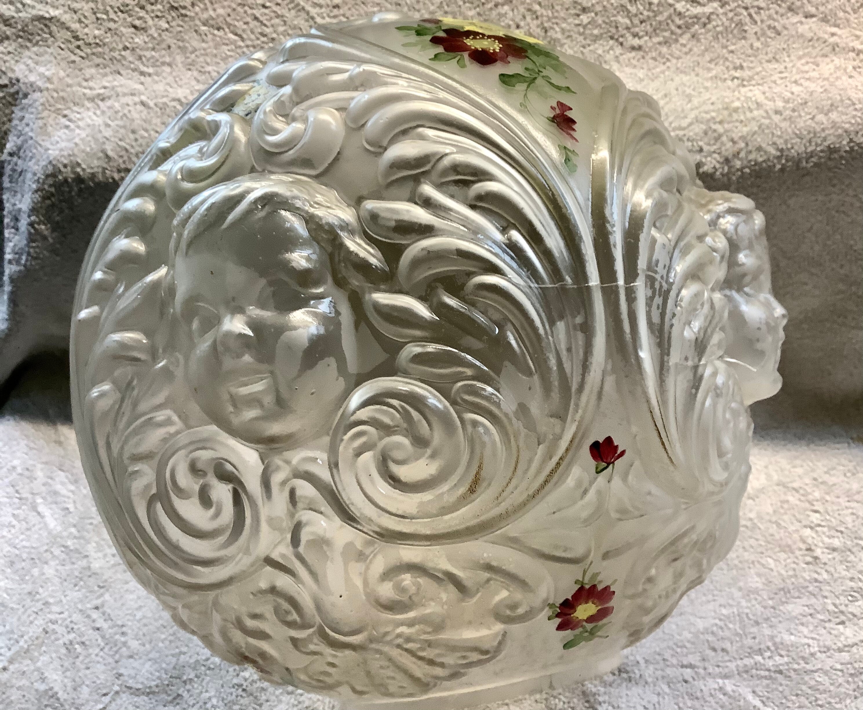 Wonderful cherub globe. Florals and cherubs in raised relief. Crack extensive but piece intact. Disposal beautifully