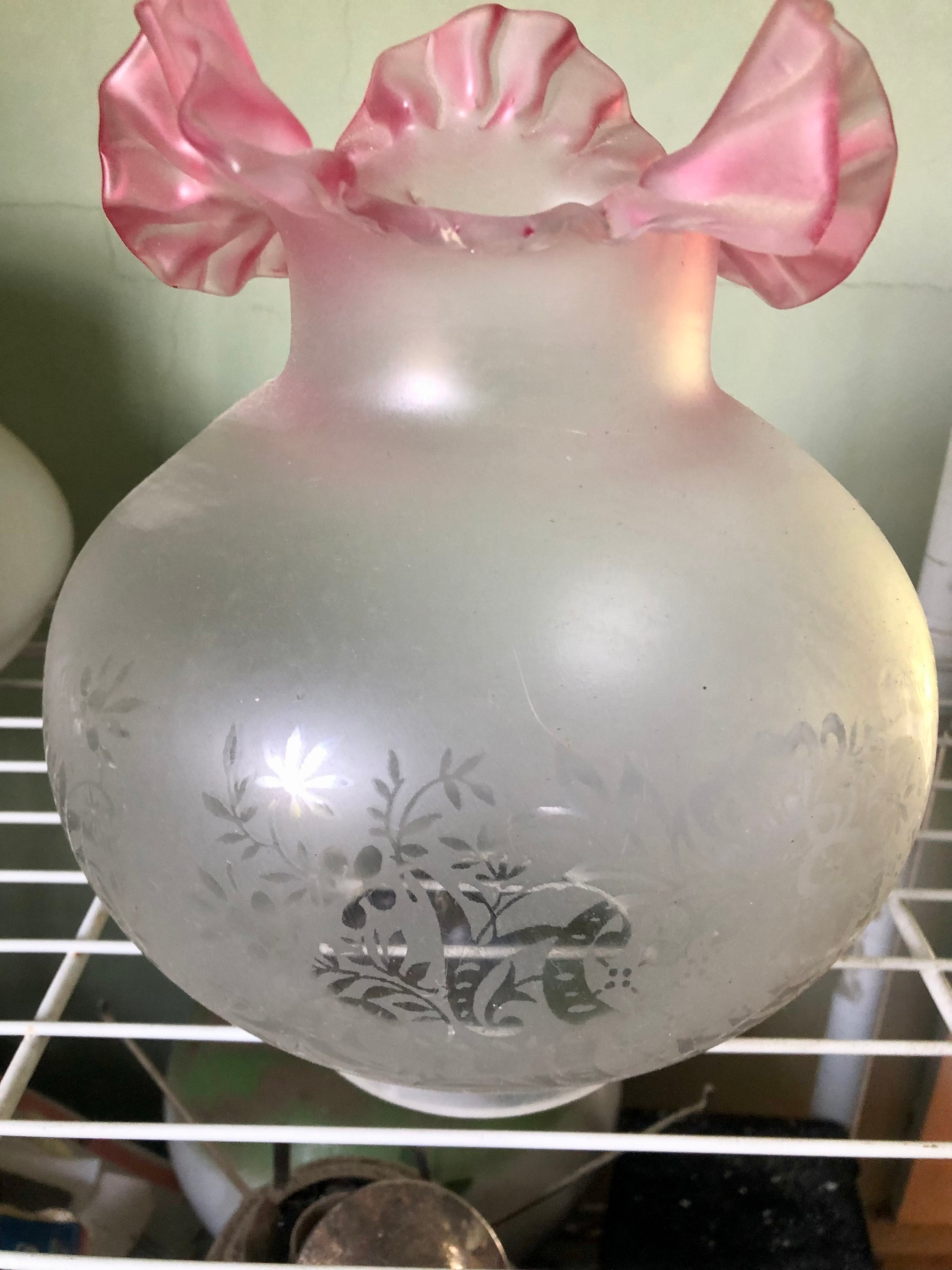 Etched ruffled shade. One ruffle broke. Displays nicely