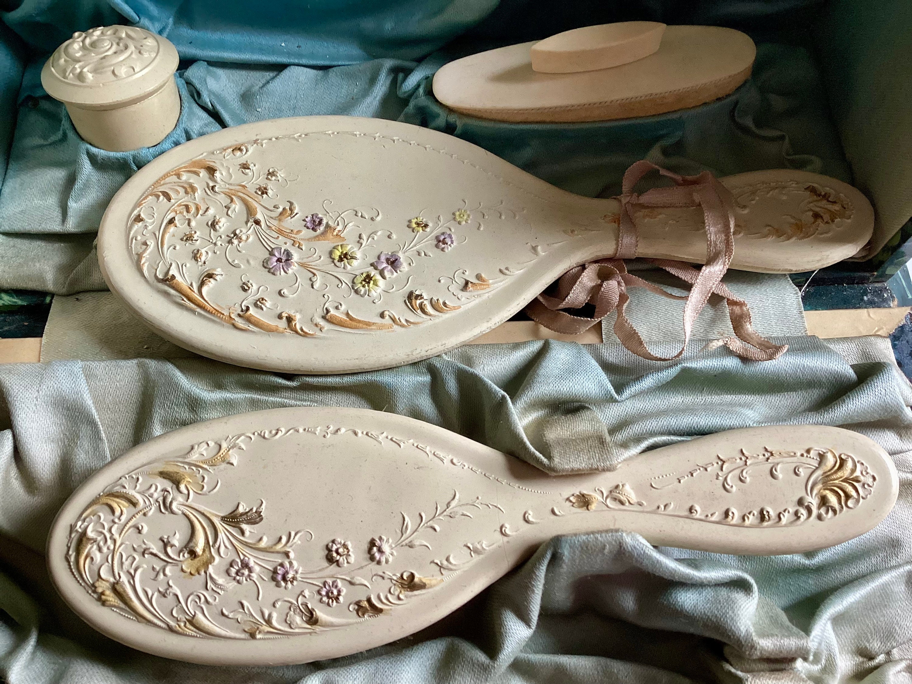 Victorian upright celluloid vanity box. Celluloid vanity implements within. Snap closure