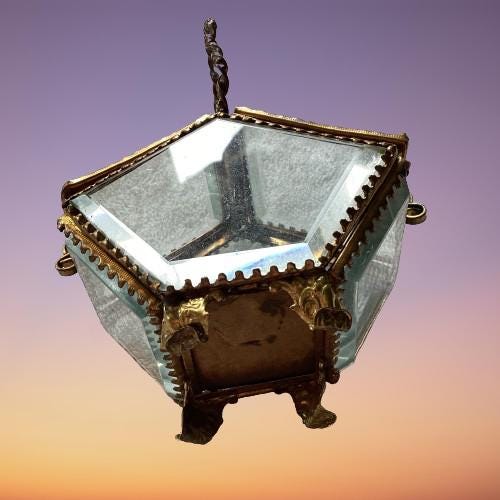 Antique French Bronze Beveled Glass Vitrine Basket Casket Box