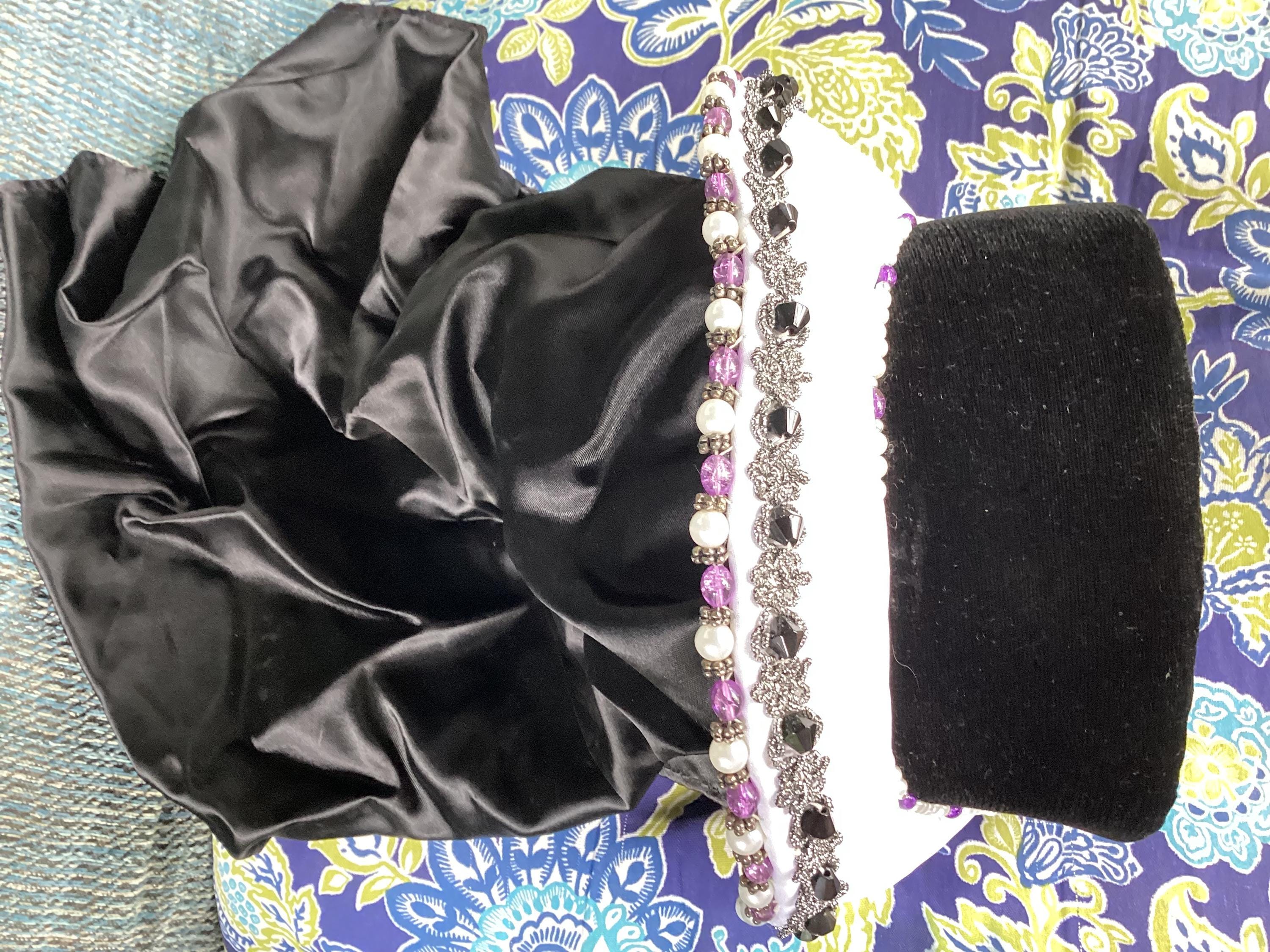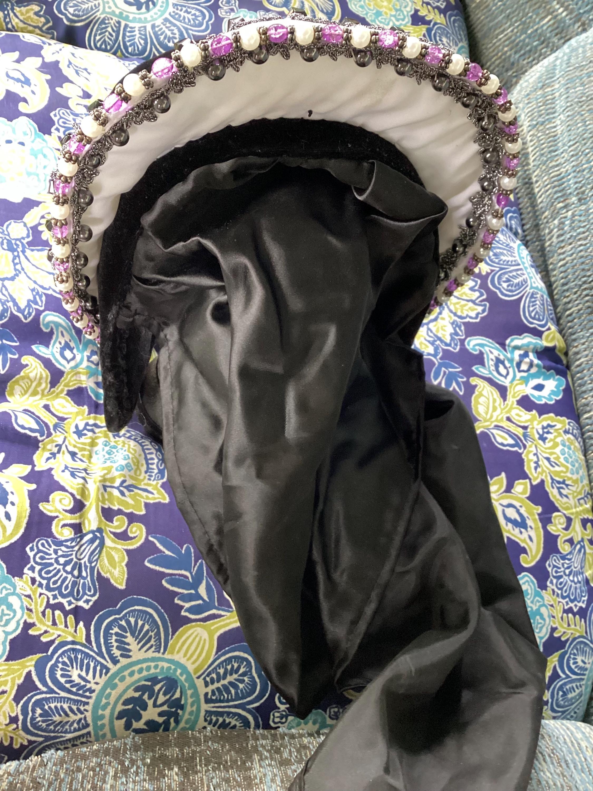 Renaissance Medieval hood headpiece. Jeweled faux pearl and lavender accents. Black with white and veil.