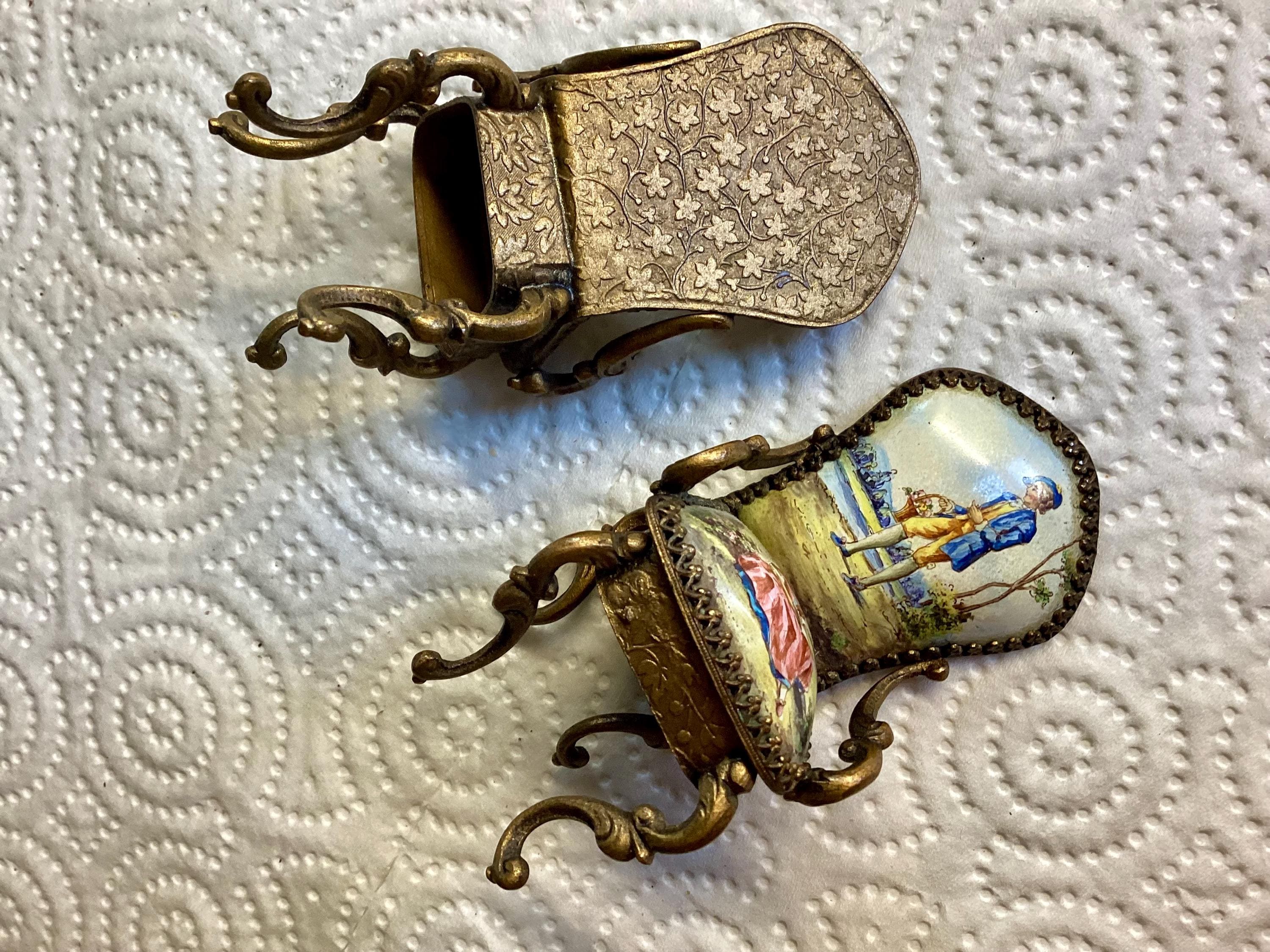 Two Viennese enamel miniature dollhouse chairs. Both with sidearms
