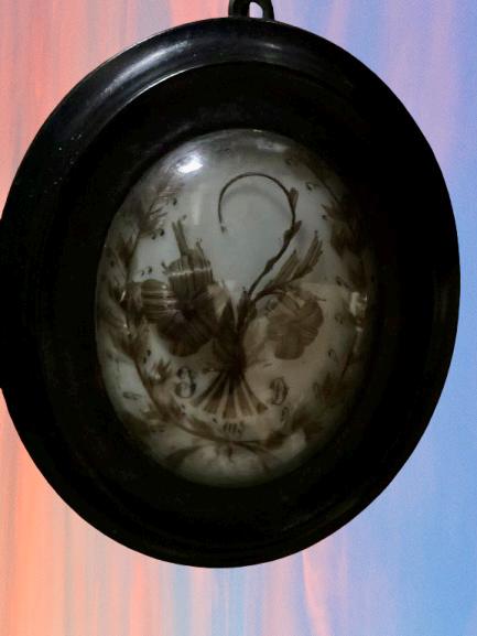 Ebony French frame with bombe glass cover lid. Interior features floral bouquet done in mourning hair with large coil and wreath surround. Back ring hang. Measures