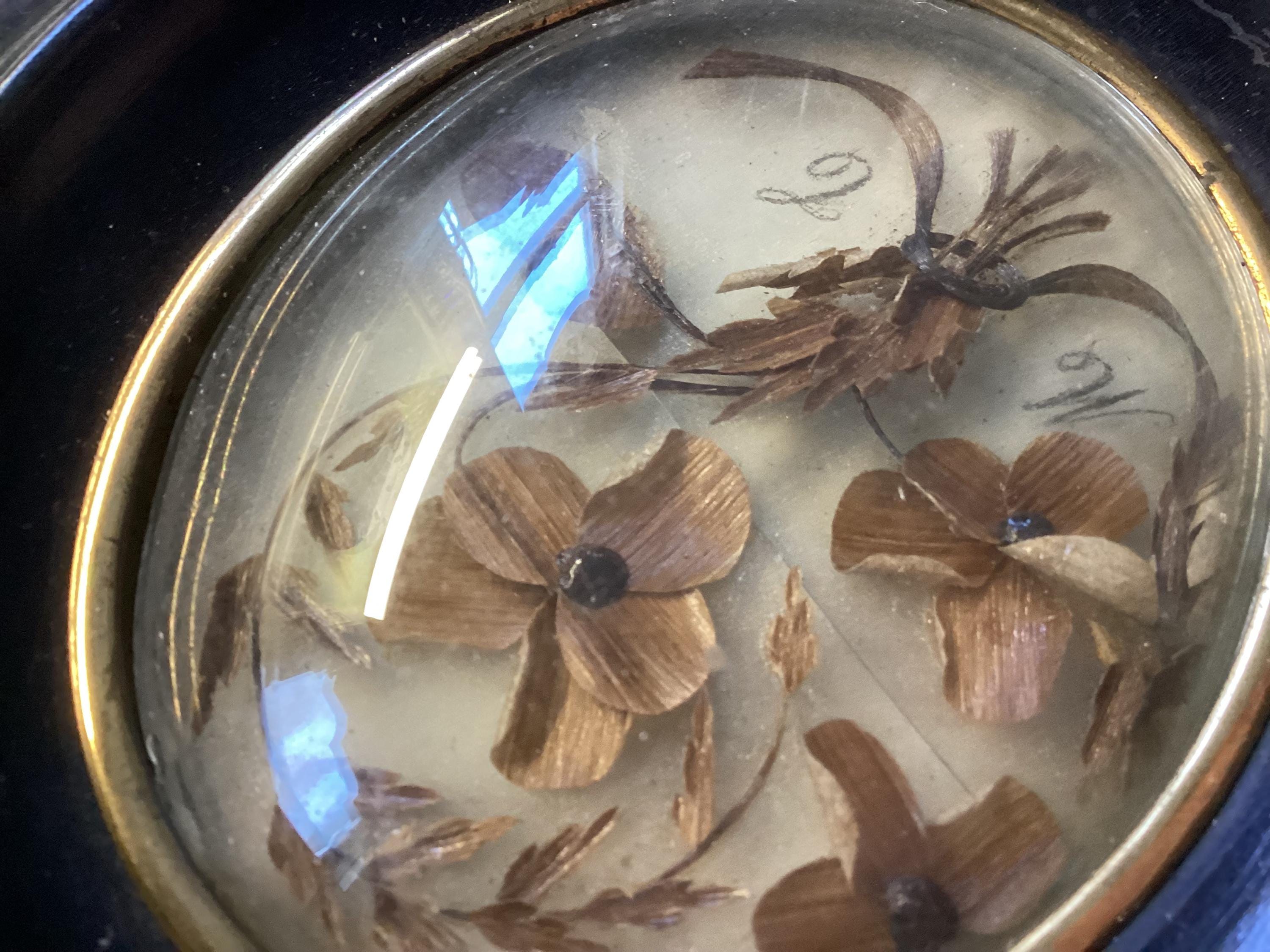 French mourning hair. Set in ebony Bo be glass frame. Floral bouquet of loved one. Measures. 6” x 5 “