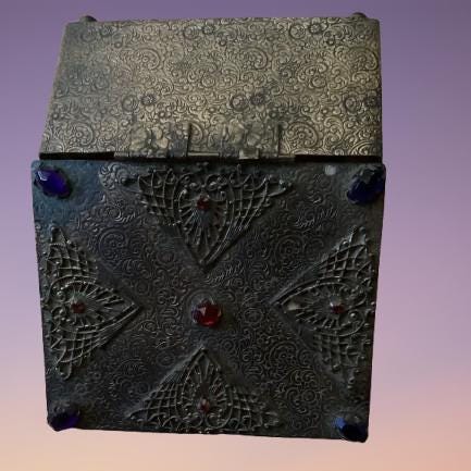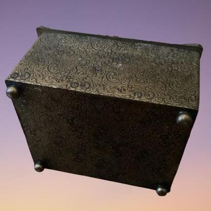 Czech Bohemian Filigree Jeweled Casket Box. Cover lid with raised relief filigree and jeweled. Wood lined interior. four ball feet. Jeweled corner repair as shown.