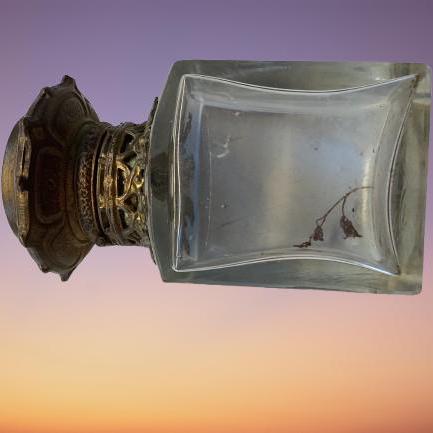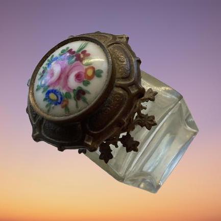French enamel crystal scent perfume bottle. Cover lid features florals. Elaborate collar mounts. Crystal square bottle. Measures 3” x 1 1/4”.