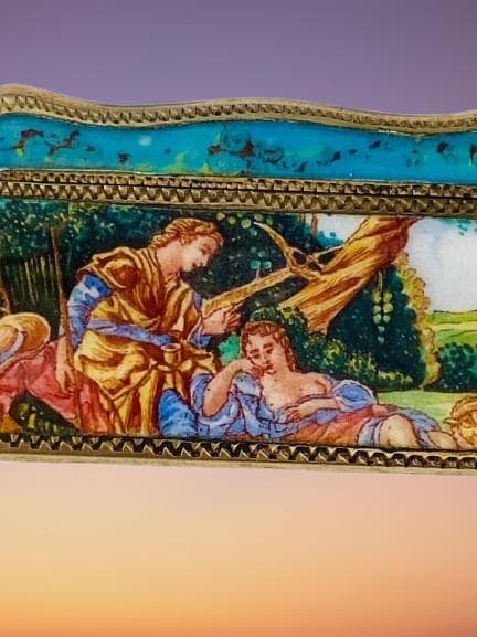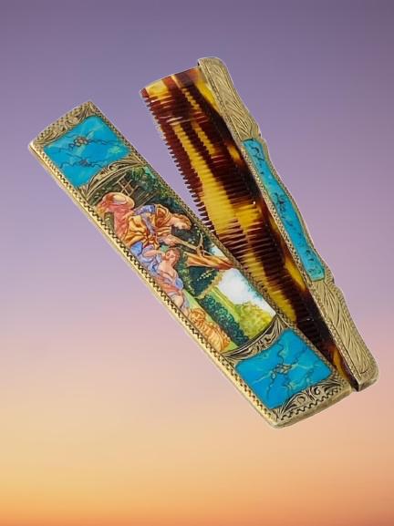 Italian enamel comb dating circa 1940. The comb is made of continental 800 grade silver (unmarked but tested) and has a wonderful vermeil finish. The comb is beautifully enamelled with a hand painted design featuring a courting couple in period clothing in a pastoral setting. The picture sits within a rococo styled silver and faux turquoise enamel border.