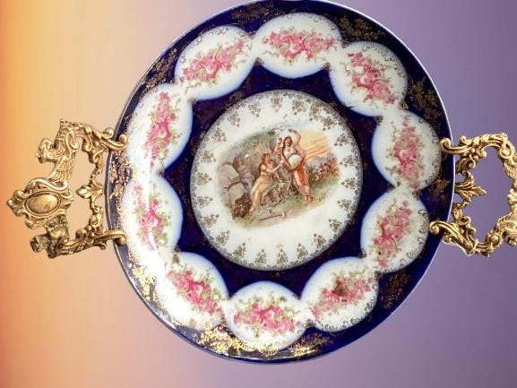Lovely Fragonard Tazza Plate Stand. Cobalt blue with fragonard cartouche surround by pink floral cameos. Plate set in stand with gilt side handles. Base set on four feet.