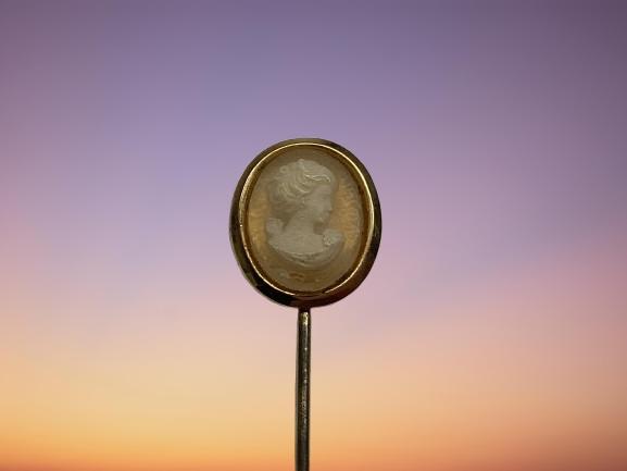 Antique hand carved cameo stick pin. Features lovely side bust view of demure woman.