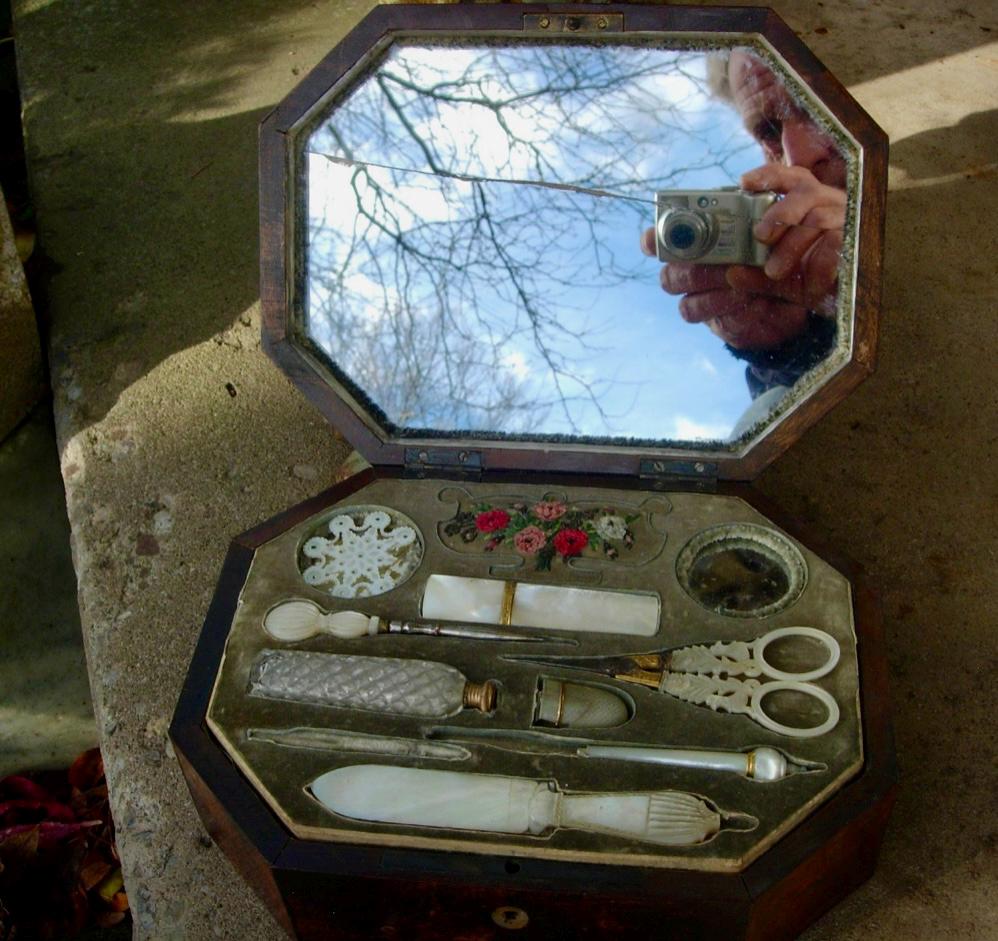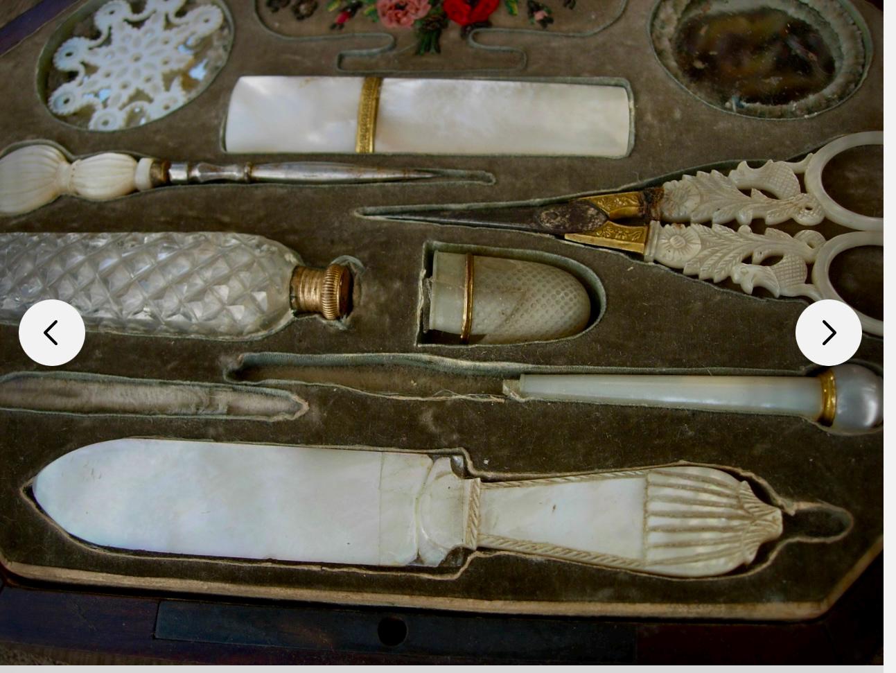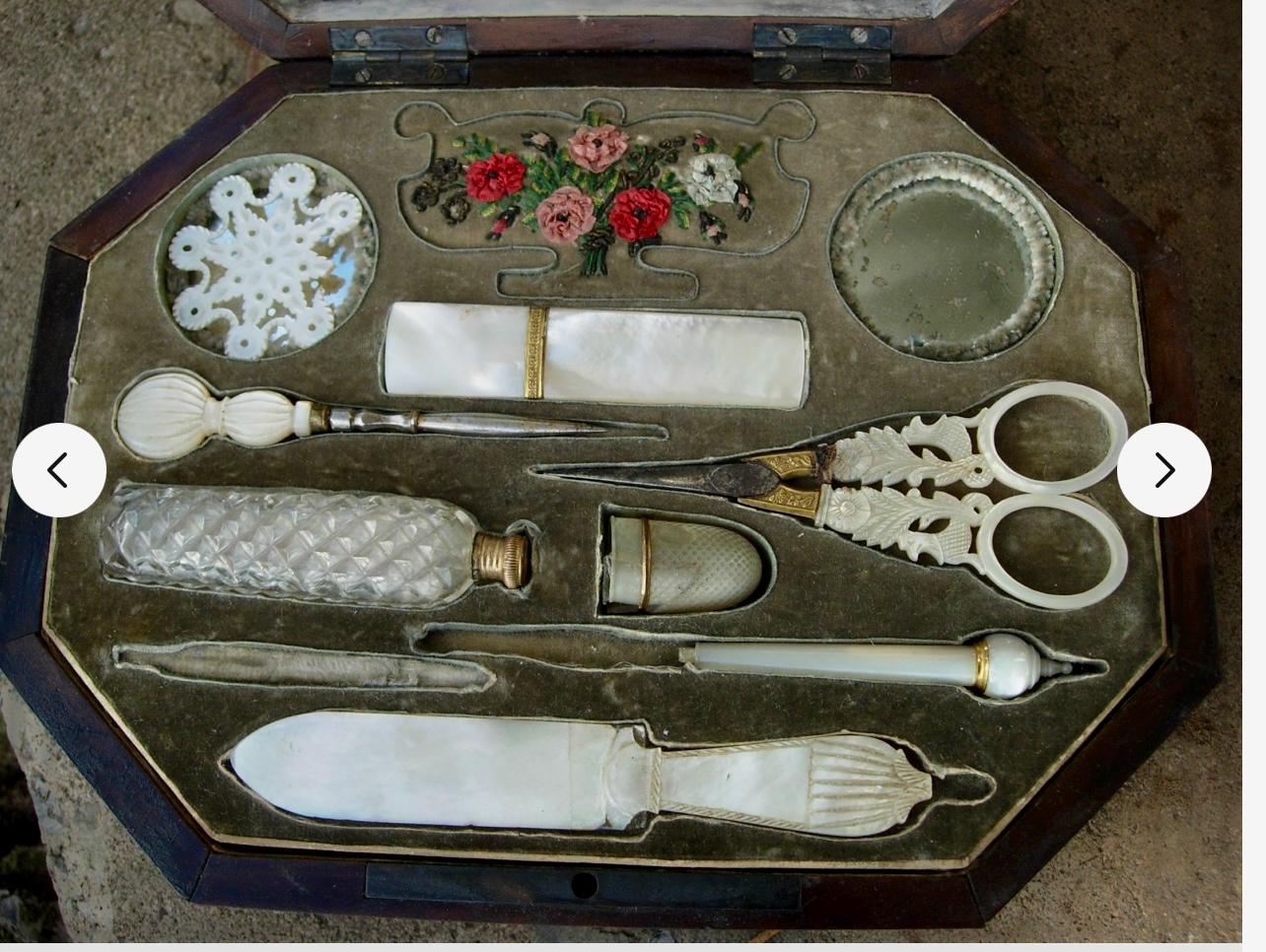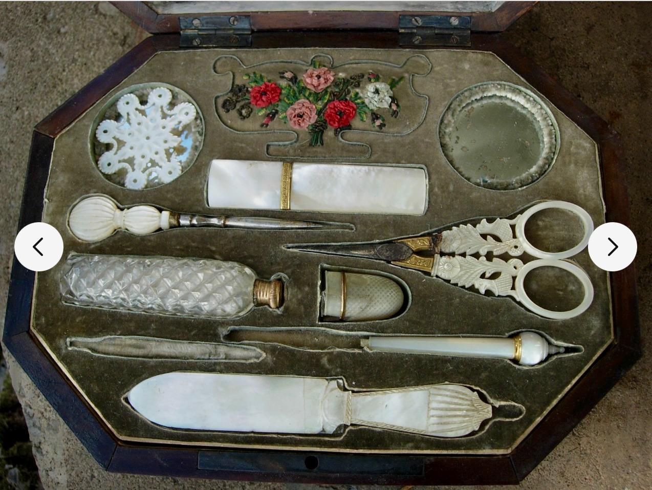 Includes scissors, needle case, crystal vile with silver top, awl, as well as other tools.