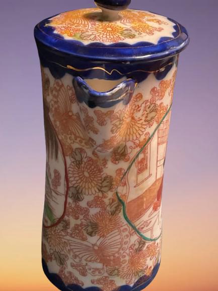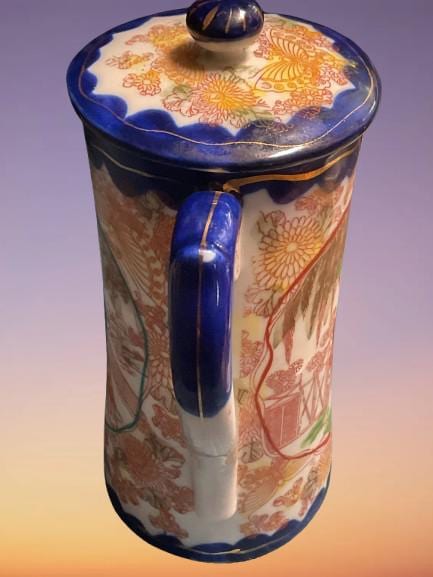 Japanese Kutani coffee tea chocolate pot features intricate designs of geishas, mountains, and other elements typical of traditional Japanese aesthetics. The multi-color painting on the pot reflects the craftsmanship of the early 20th century, making it a unique and collectible piece for tea and coffee enthusiasts. Originating from Japan in the early to mid 1900s, this Kutani pot showcases the artistry and history of Japanese antiques.