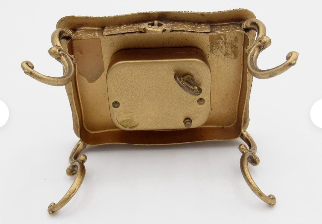 ITEM DESCRIPTION: Antique Austrian Enamel Table with Music Box, Great Works and Musical Sound. You wind the key then pull the nib and the music plays. When pushed in, the sounds stop. The last photo shows other pieces I have for sale including a couch and chairs.