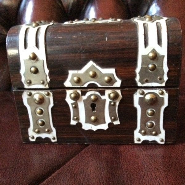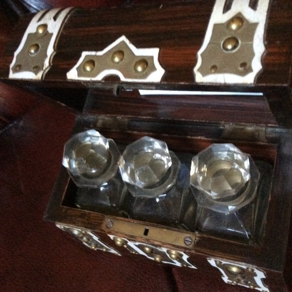 French perfume scent casket scent casket decored in overlaid wood with petite bosses. Lined veletine interior with three glass scent bottles. Measures 10.5cm x12.5cm. Scent bottles 7.5cm. Applied white paint has some flaking commensurate with age with few bosses in need of replacement.