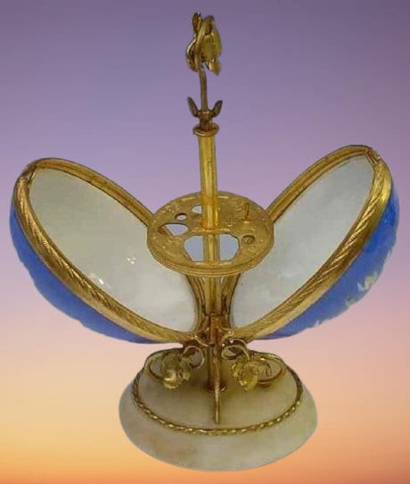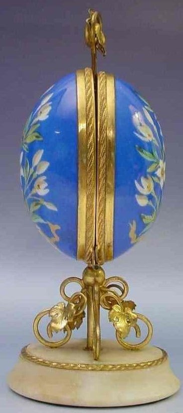 French Grand Tour Palais Royal Kiln Fired Enameled Sewing Egg Etui on an Alabaster Plinth. The Etui features fancy mounts and the plinth has gilt ormolu scrolls and grape leaves and a grape leaf finial. The Etui originally held five missing pieces . Measures 10 ½” H x 4” x 3”. The condition is very good with no damage or repairs. Small Gap when Closed…A real beauty worthy of the Napoleonic Pariasian Period!