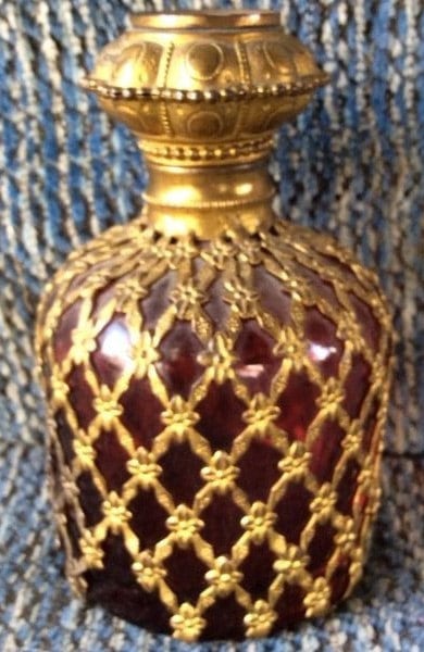 Large French Palais Royal scent bottle. Cranberry glass bottle with delicate lace metalwork throughout. Note base area for minor loss to peircing. Bold collar mount with Eglomise coverlid. Measure: 4 1/4" x 2 3/4"