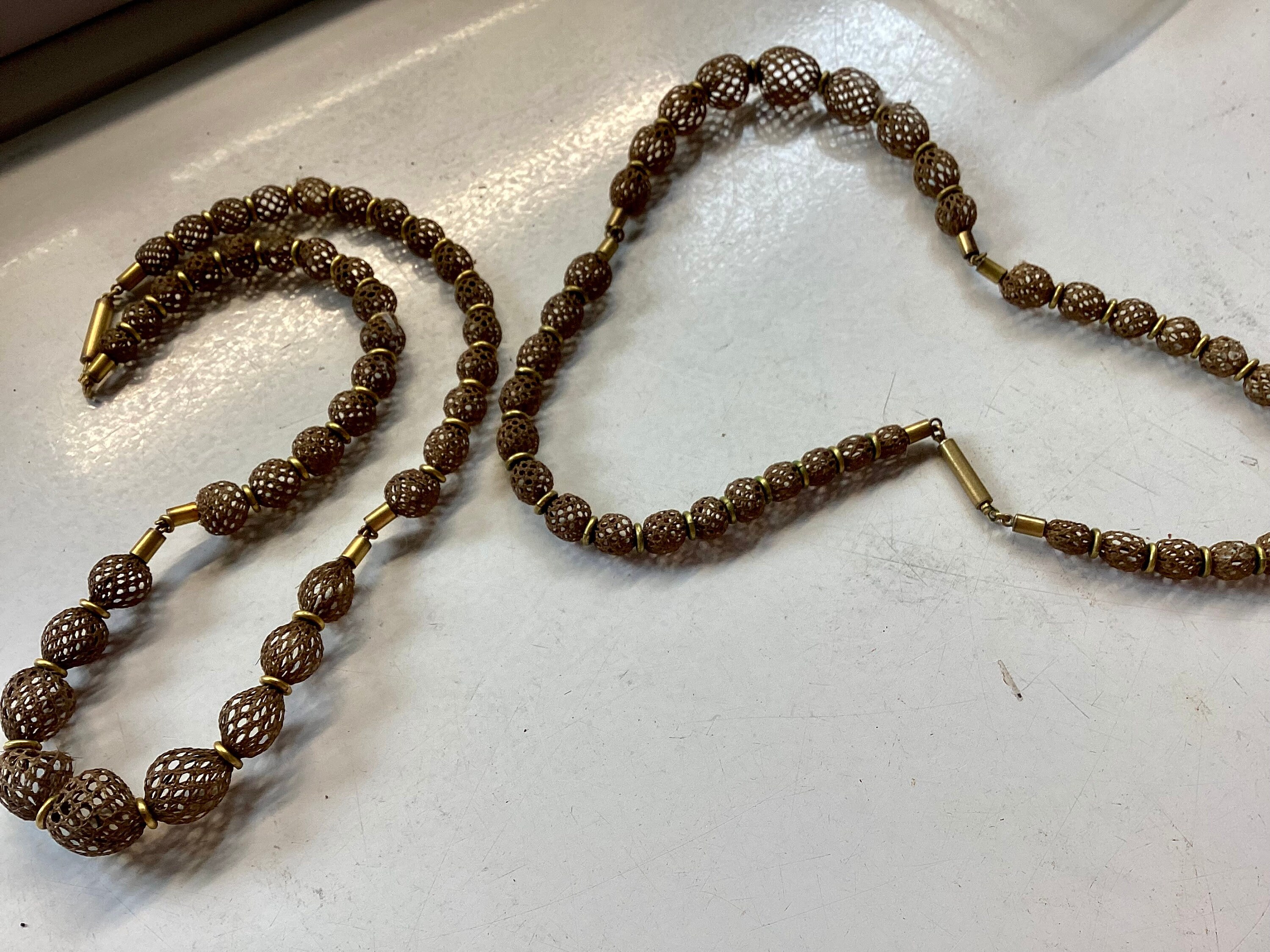 Antiques:Mourning HairSpectacular matched pair of Victorian hair necklaces. Perhaps a love token from twin sisters? These two necklaces are a terrific example of the fine art of hair jewelry. Each one consists of 39 graduated, pliable balls of braided hair. They are identical except one is 3/4" longer than the other. The nature of the design allows for stretch. Undone the necklace measures 20"-21" long. The clasp is very secure on both and has not been tested for gold. There are no marks on the clasps or other ...can be sold seperately.