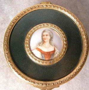 French Bronze Miniature Portrait casket box. Portrait cameo,hand painted, and set surrounded with raised relief gilt band. Casket further coordinated in raised relief metalwork. Sizable to keep you favorite trinkets.