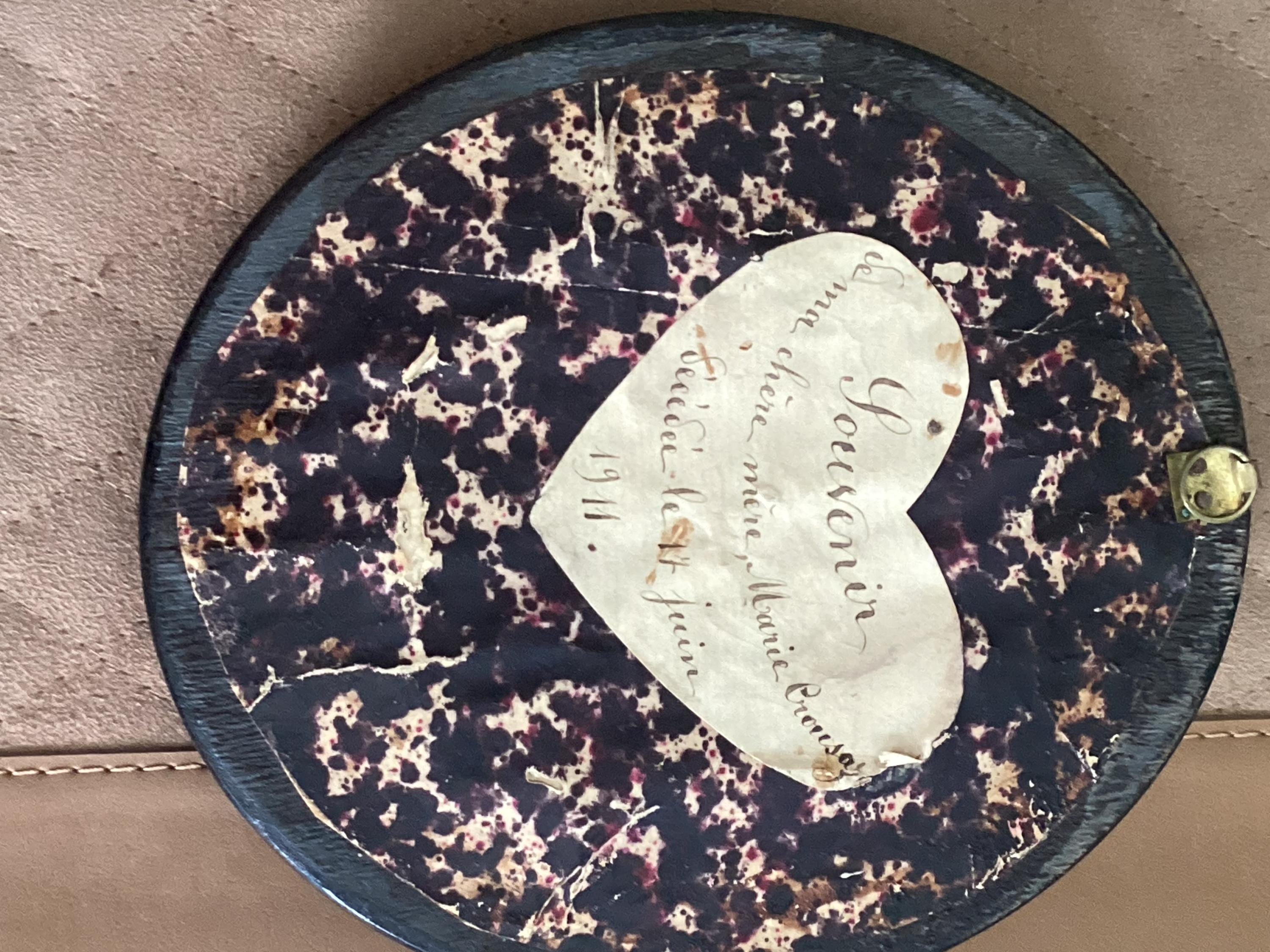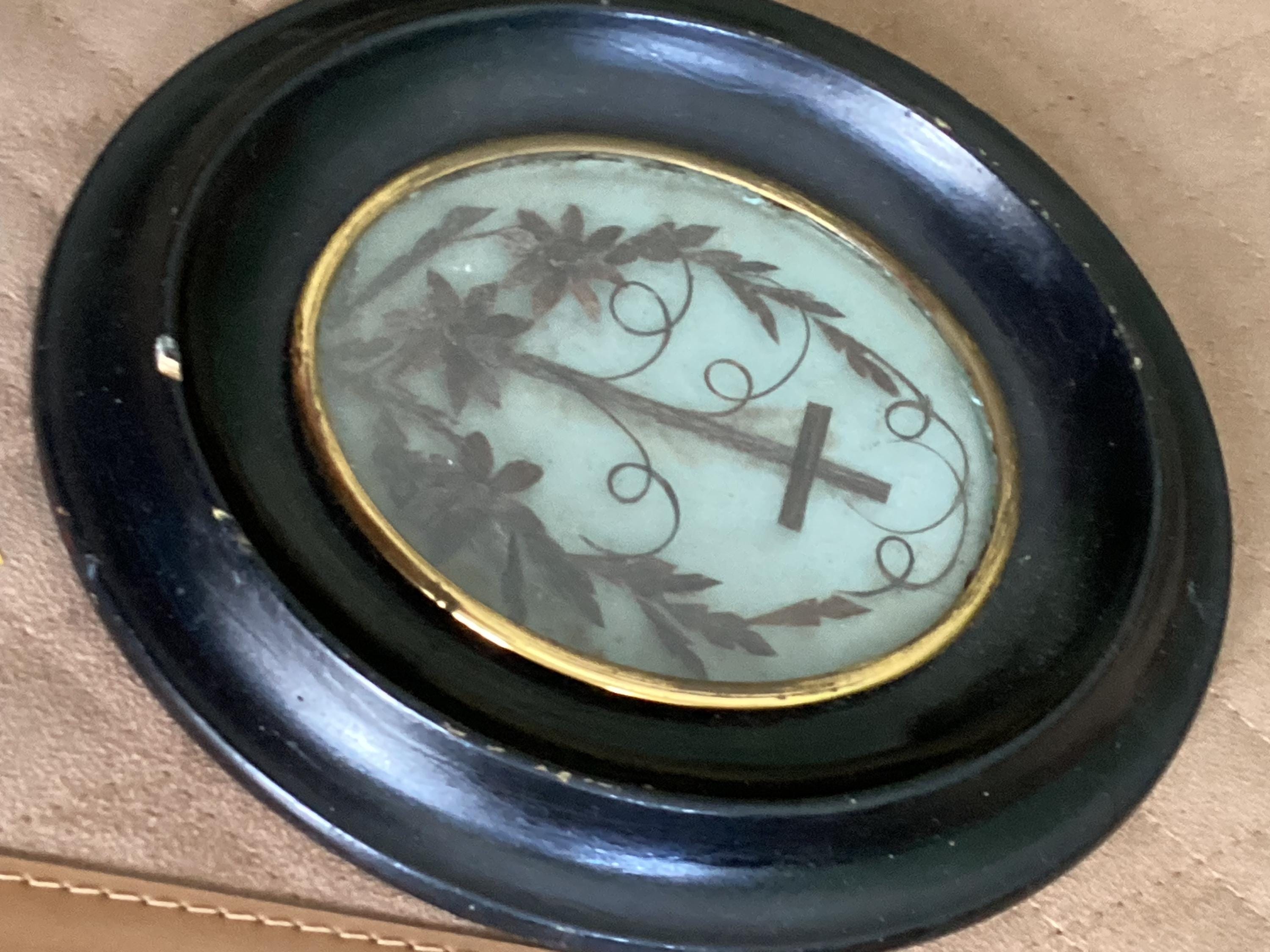 French mourning hair shadow box. Measures 16 cm. Cross with wreath constructed of hair snipits in memorandum of deceased loved one.