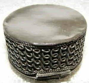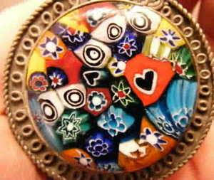 Millifiori art glass casket box with colorful abstract motif on top of box. Top is a thick or raised layer of italian art glass. Finish is slick and smooth. Box sides have a tight scrolled design covering the perimeter of the box and around the top. Very nice workmanship. Measures in height 2.5 cm and is 4.5 cm in width.