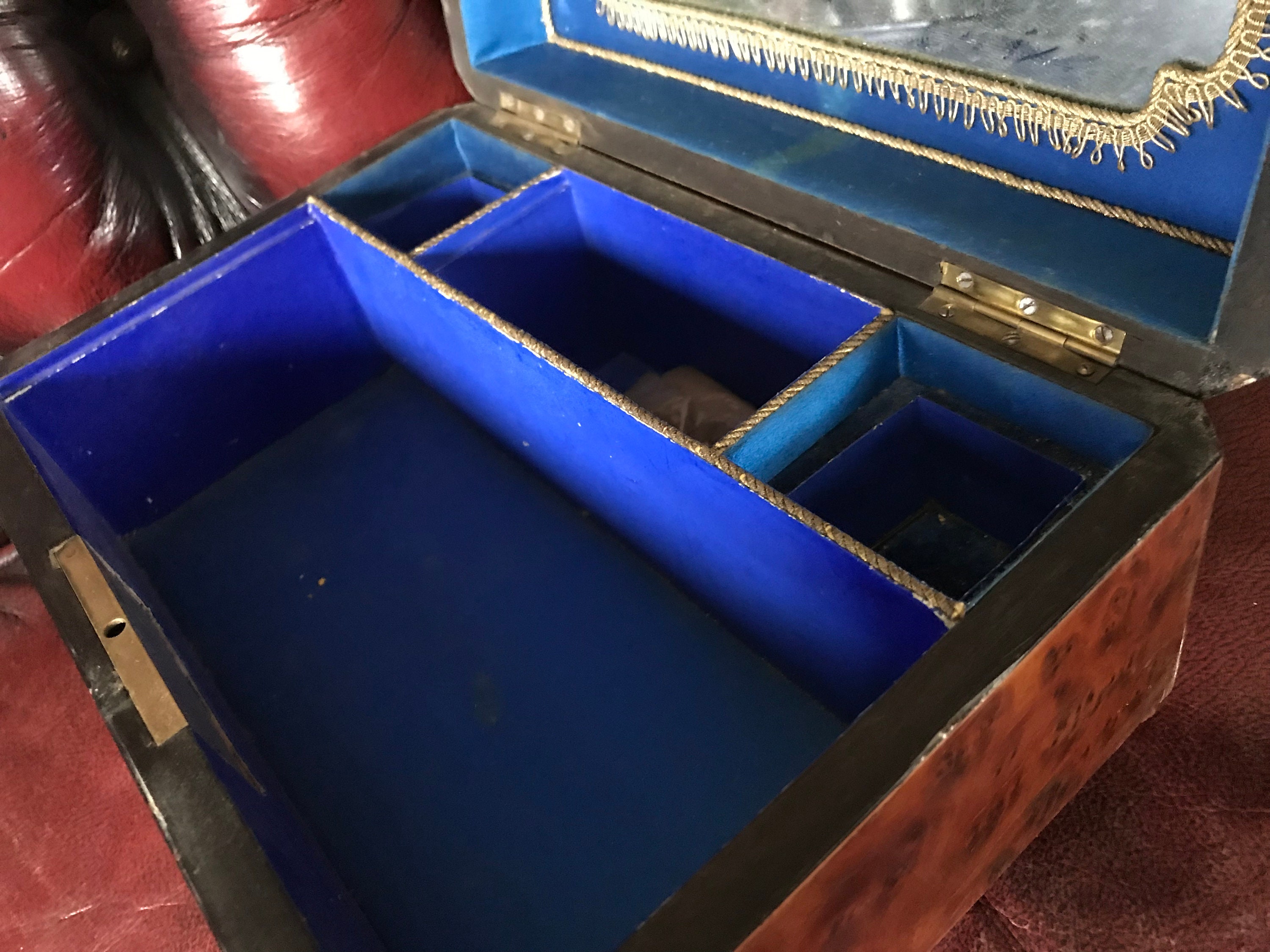 French ROSEWOOD Marquetry Boulle sewing scent casket box. Blue Velvet interior with mirror. Gold threaded