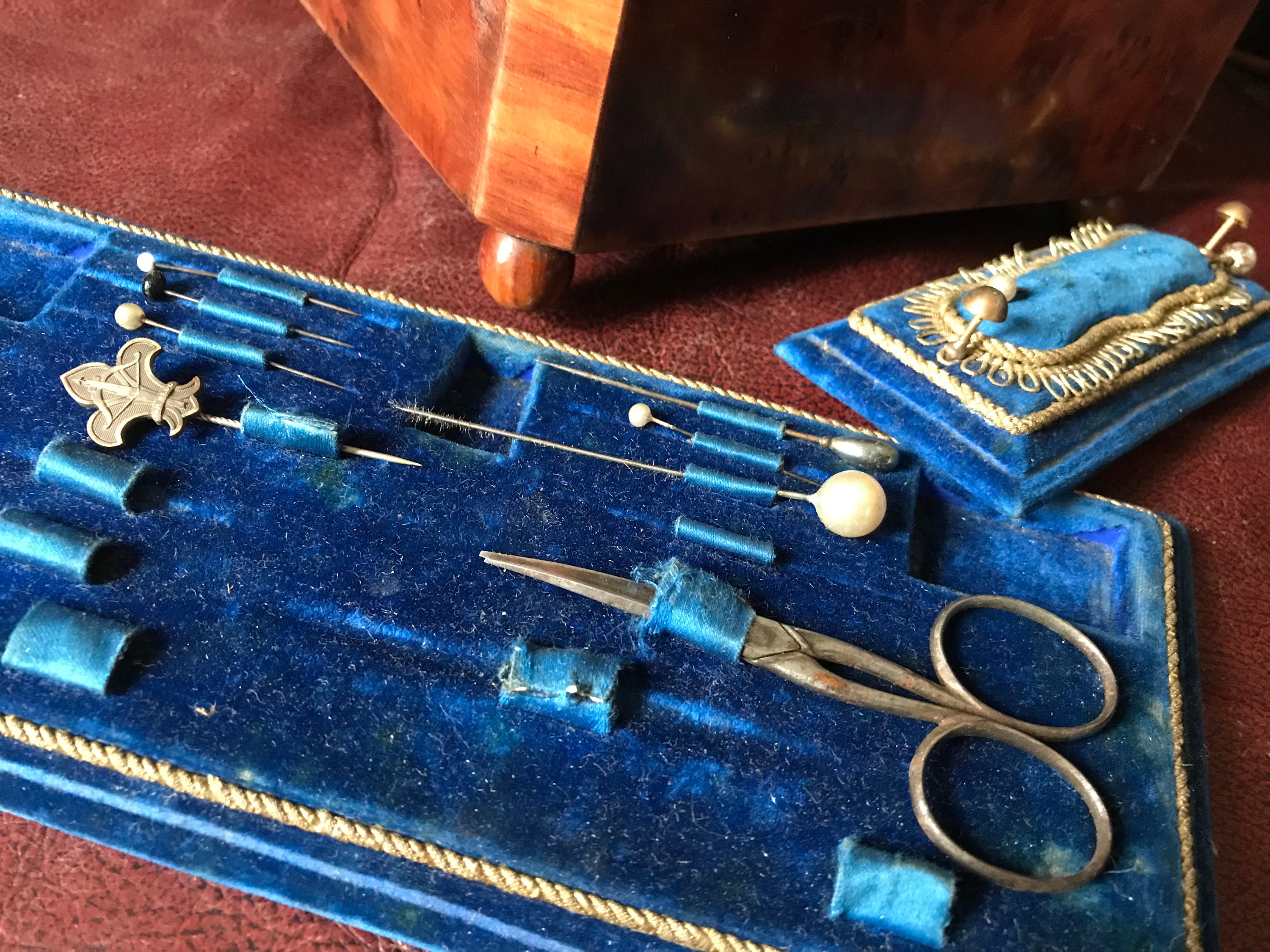 Trim with pearl accents. SEWING IMPLIMENTS FEATURE COORDINATING PEARL TIP NEEDLES AS WELL AS A PAIR OF SCISSORS. INTERIOR COMPARTMENTS FOR TWO SQUARE SCENT BOTTLES ON EACH SIDE. OUTSTANDING CONDITION FOR ITS AGE. WOULDN,T BE DIFFICULT TO FIND THIMBLE AND OTHER PIECES TO COMPLETE THE SET. There are also insets for baccarat scent bottles to complete necessaries.
