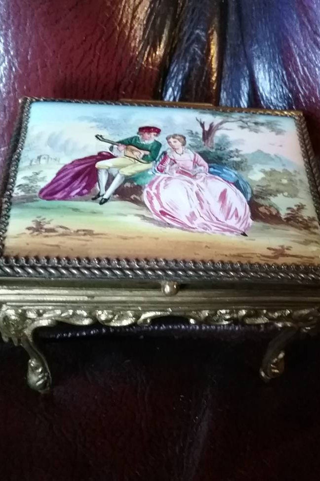 Exquisite Vienesse enamel table. Loving couple adorn tabletop with long legs to table. Table on is being sold in this listing. OTHER PIECES are available in separate listings. BASE marked. Front lift top.