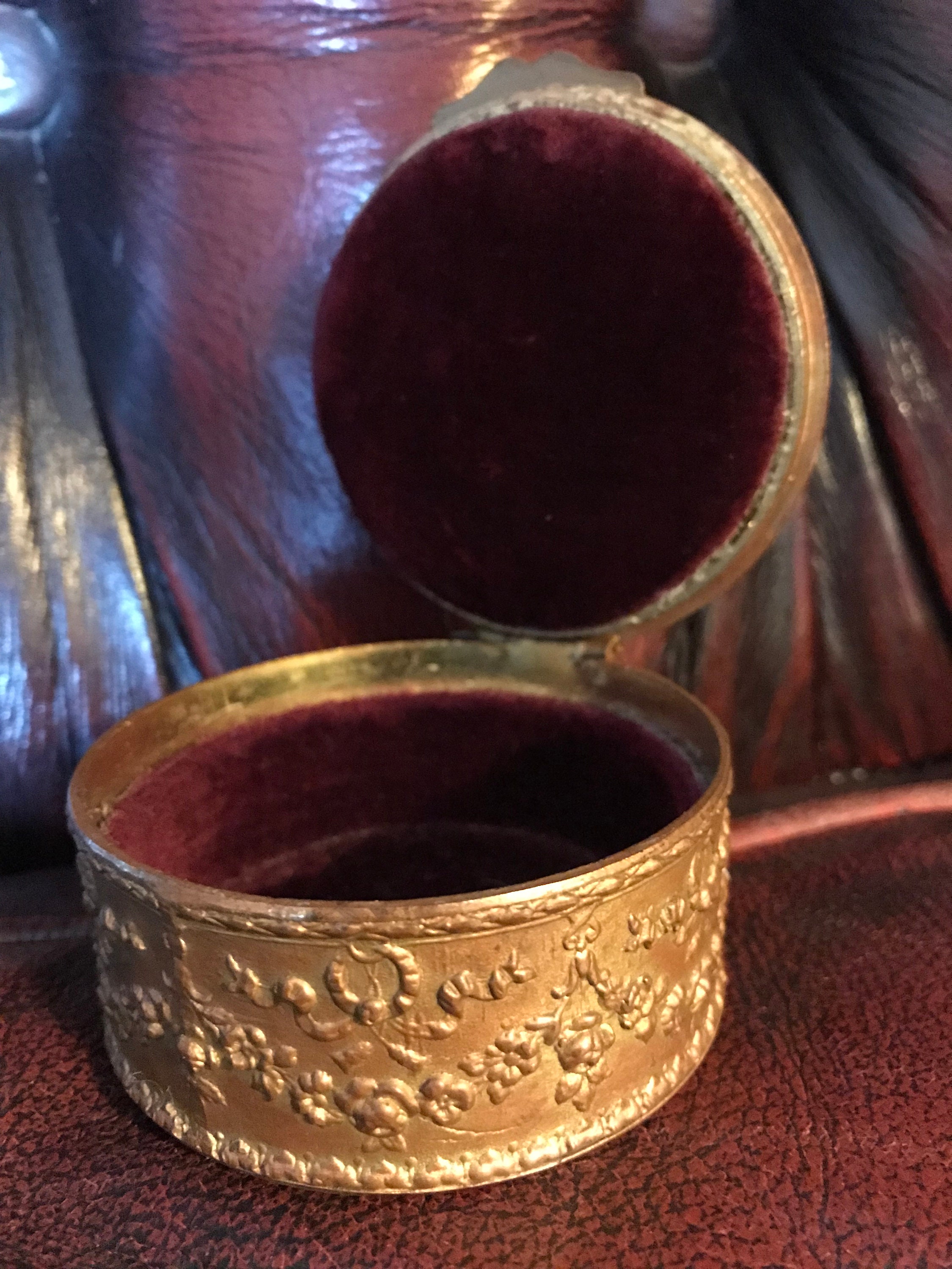 Bronze Miniature casket box. Lined interior. Miniature Portrait with raised relief round band..raised relief throughout base. Maroon cover.