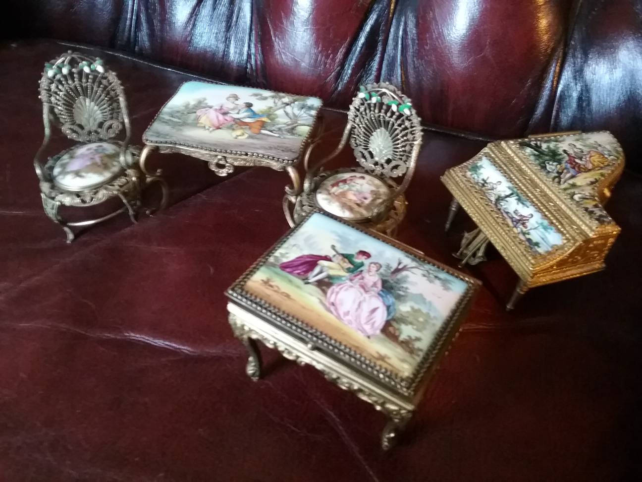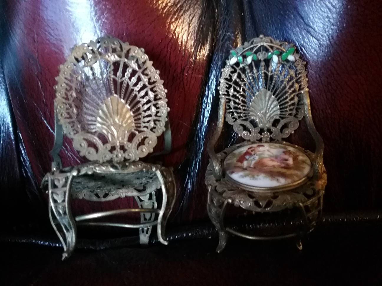 Green jewels adorn a filigree backrest with viennese enamel cushions. Very Victorian in appearance. Pair sold together. OTHER PIECES sold separately in other listings.