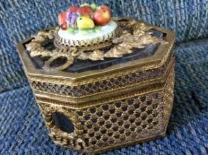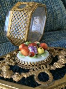 German Forums are Casket Box. Lovely fruits in Elfinware style adorn a cut out covelid. Lined glass interior. Fancy basket and coverlid