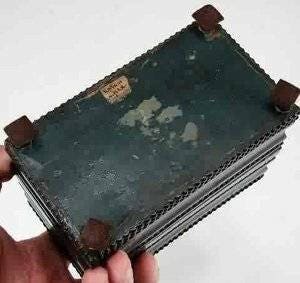 French Boulle MOP perfume casket.Hand carved casket, lacquered black with inlay hand etched chased bronze, mother of pearl, & what looks like tourtoise shell and green. Retains all its silk lining, only its bottles are missing. Footed it stands 4 1/8" tall x 5 1/4" wide.Execellent quality and design.
