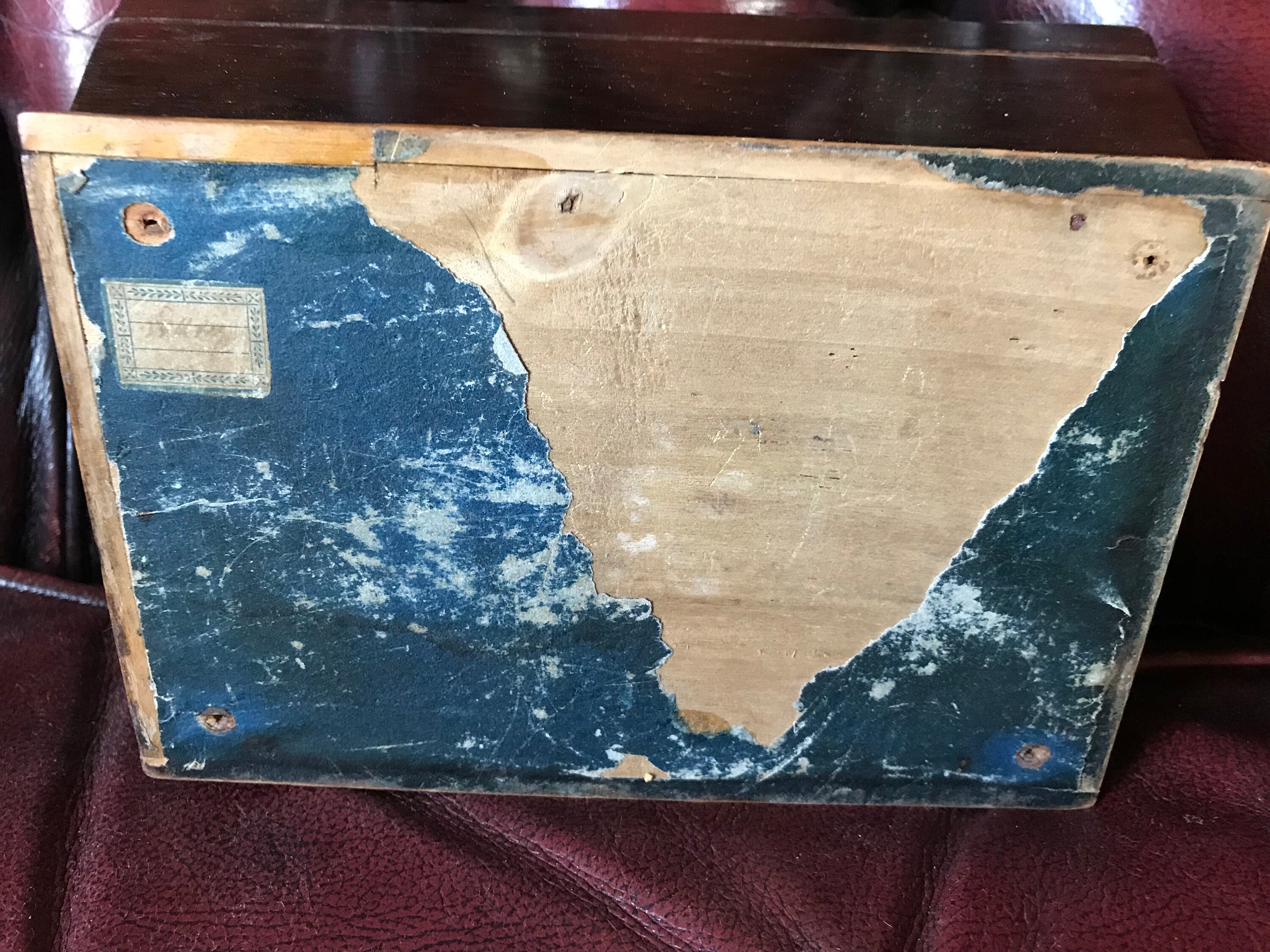 French sewing Necessaire Box. Velour fitted with needle case. needle, thread winder, and awl. blue lined base(stained) pls see pics. mirror. Case itself in tone woods with a ring top.