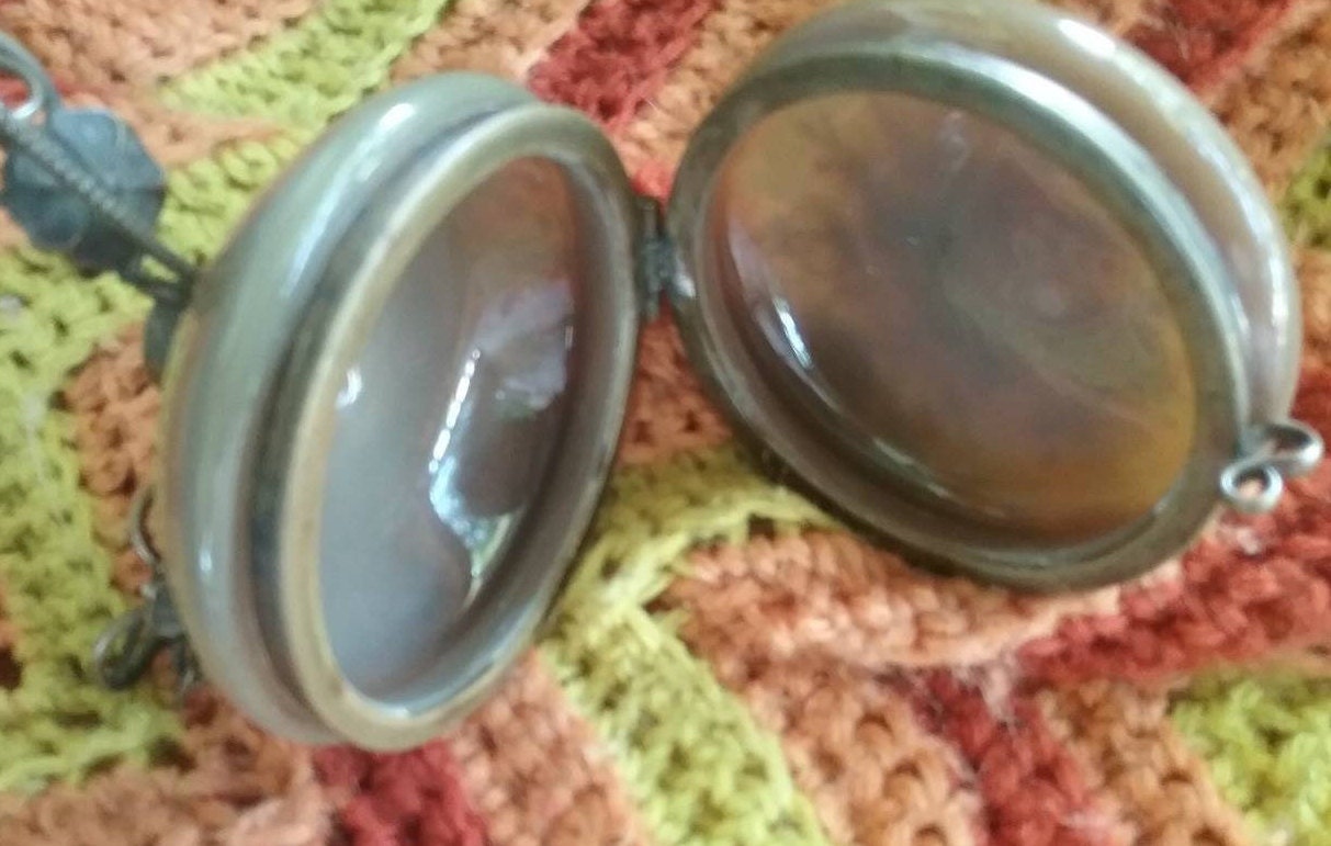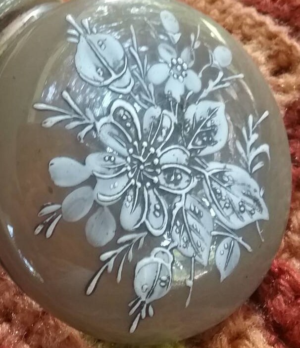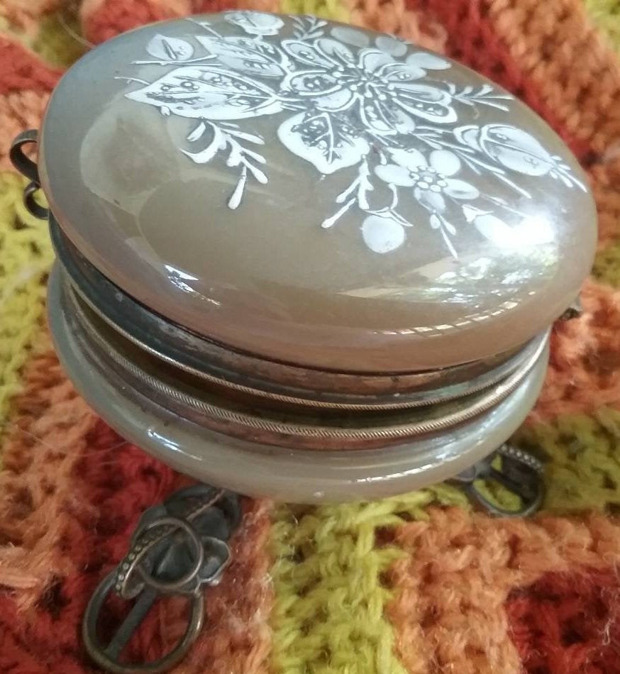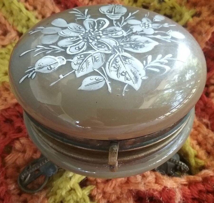 Round cocoa glass casket box. Rests on stand with eleborate scrolled feet with floral medalions. Coverlid in white hand painted enameling. S clasp closure. Closes high to base, the s clasp could be adjusted to flush to collar rim, or hinge adjustment, to close properly. Will leave to new owner. Dangle rings are present on two of feet to present charms if you will. One ring isn,t present and easily replaced if so choose. MEASURES 3 3/4" X 3" X 3 1/8".