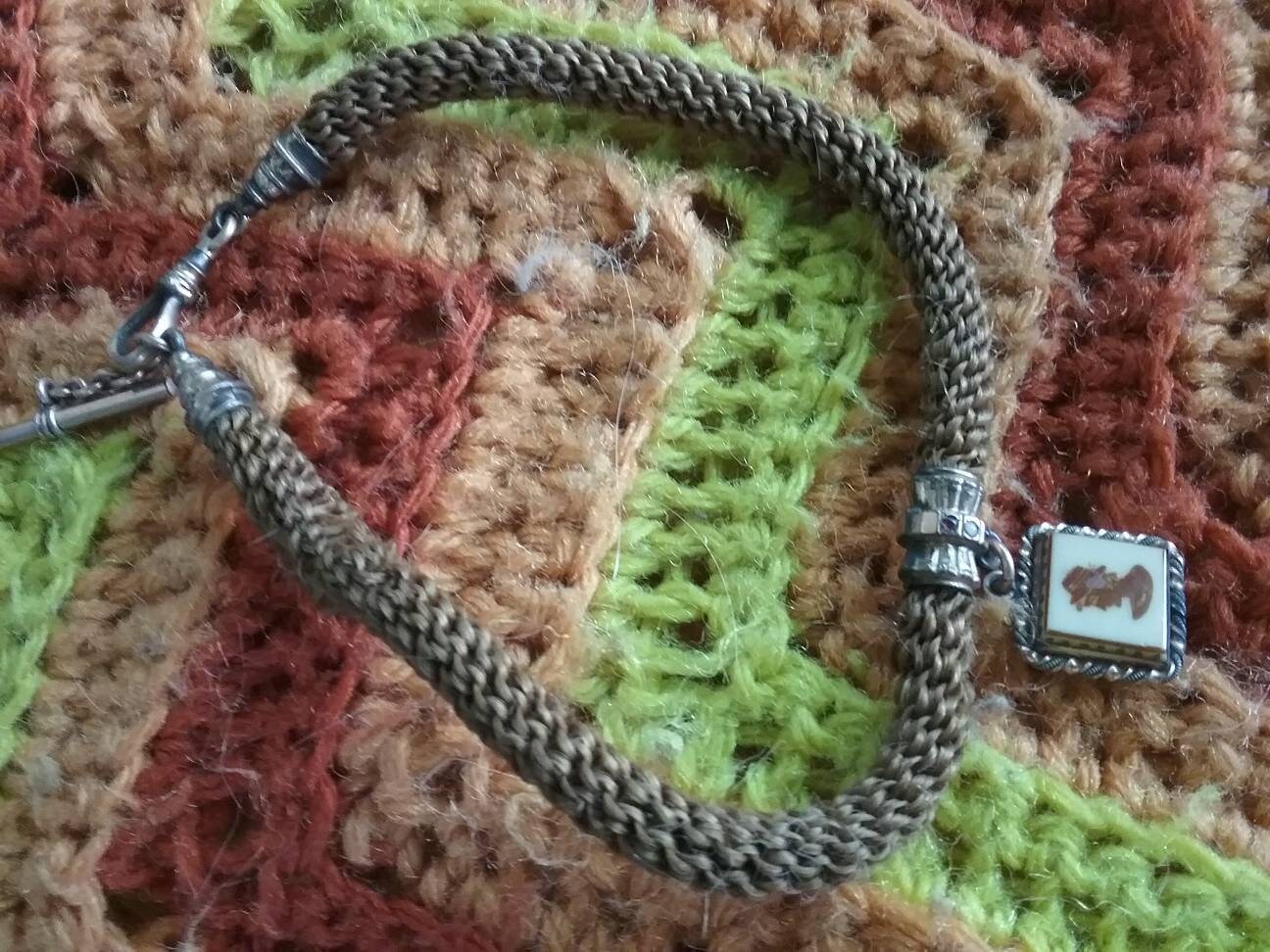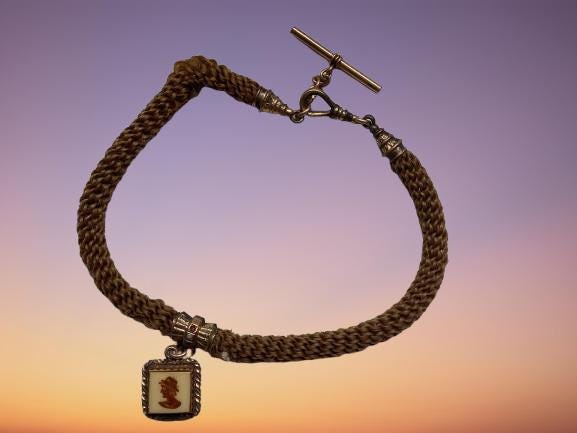 Mourning hair. Designed as watch chain. Dangle medallion and bar clasp.