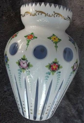 Large Bohemian overlay cut vase. Blue glass with with enamel . OVERLAY CUT WITH FLORALS. top has unique rim. Felted base.interior bottom stain from flower use