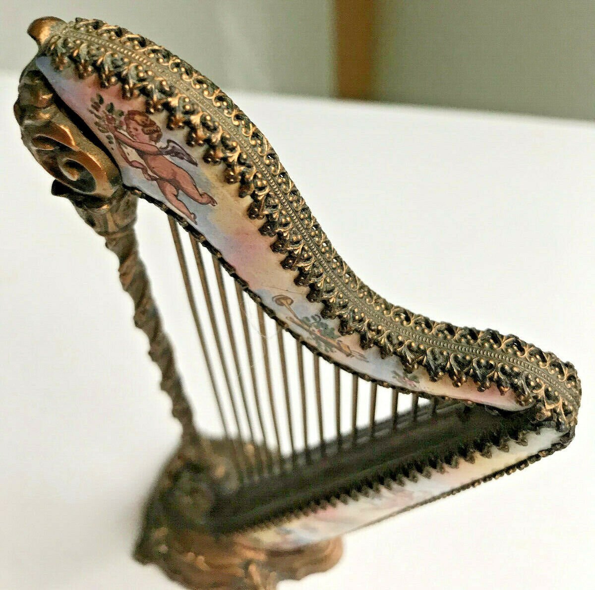 Viennese Enamel Miniature Doll House or Cabinet Harp. Measures 5" x 3" x X 1 1/4".