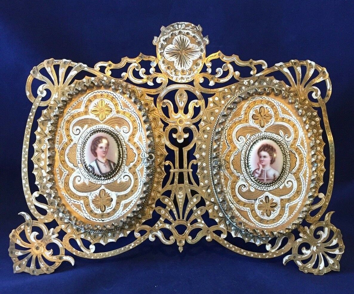 ELEGANT DOUBLE FRAME WITH TWO HAND ENAMELED BEAUTIFUL PORTRAIT PORCELAIN PLAQUES