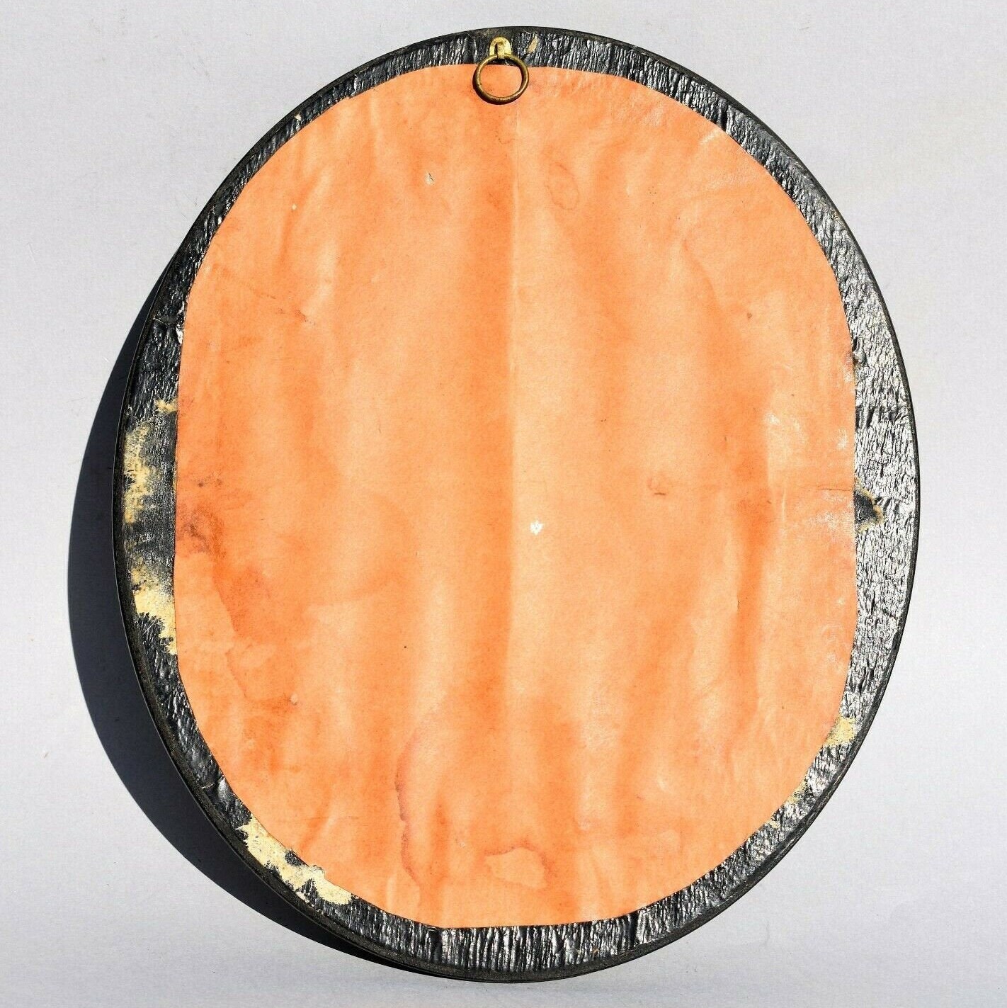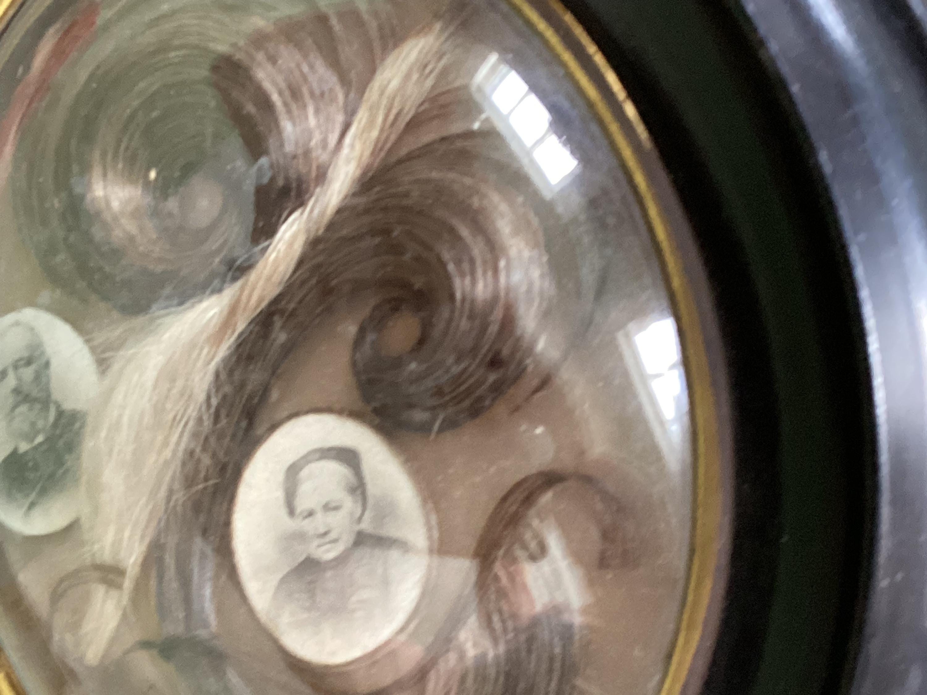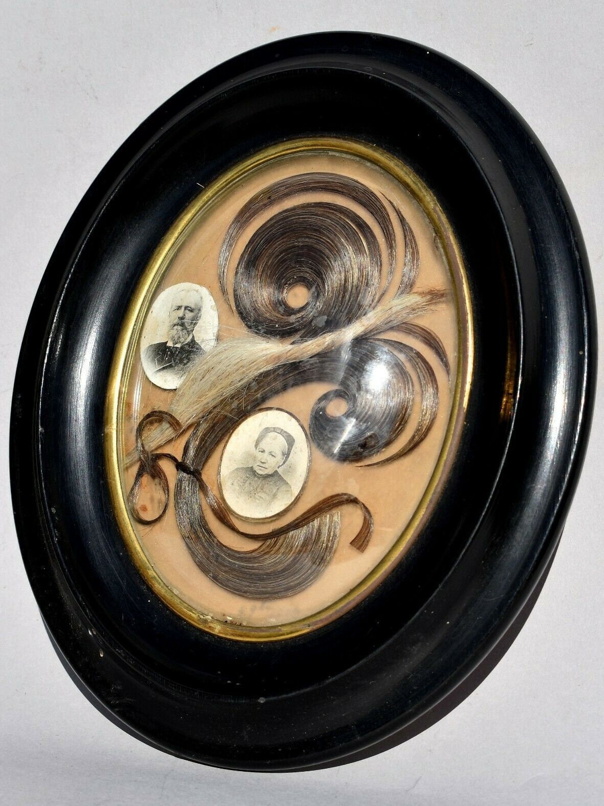 French Mourning Hair Frame. Appears to be man and wife with photos and each others hair samples done in scrolls of blond and brown, Measures : 17 x 21 cm